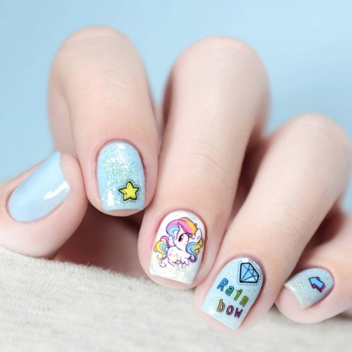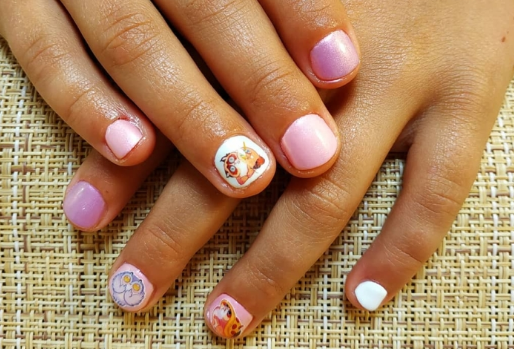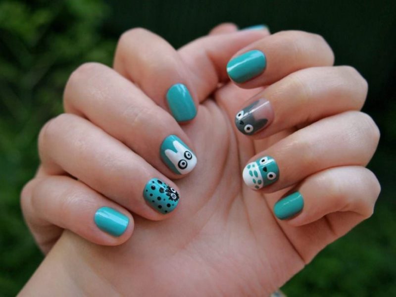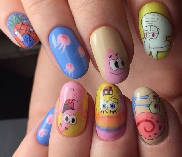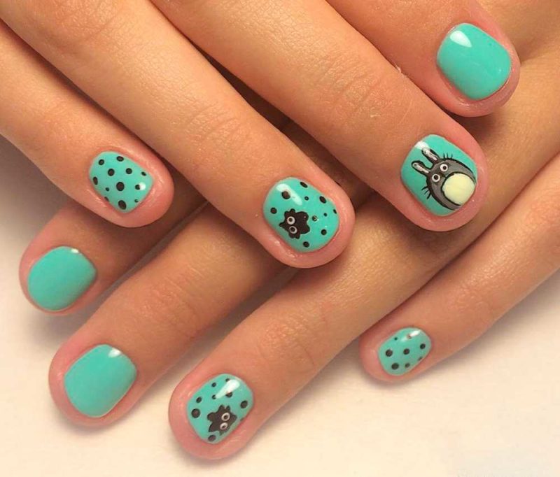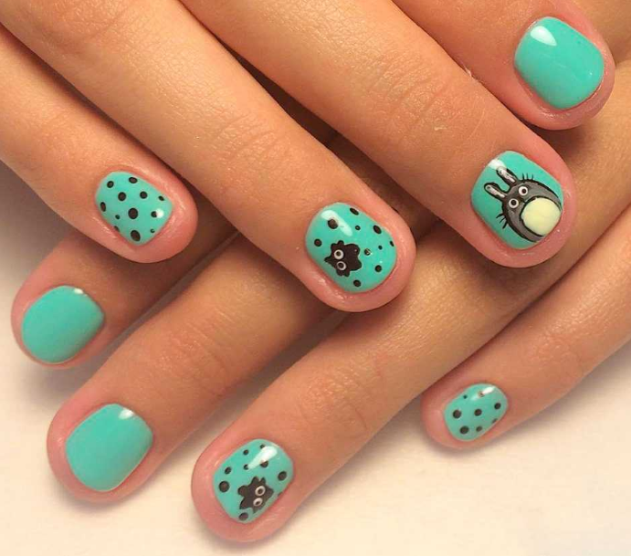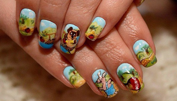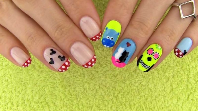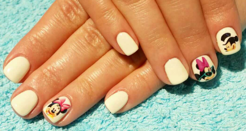 Поклонниц просмотра мультфильмов порадует маникюр с изображениями любимых персонажей. На каждом ногте может находиться разный герой.