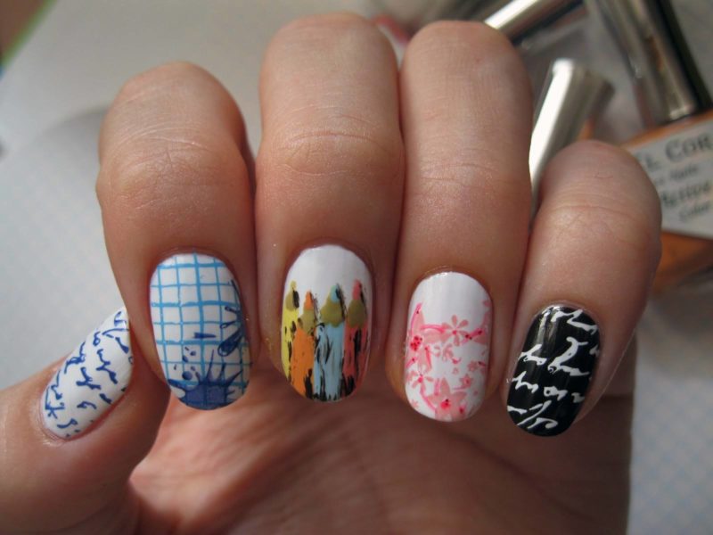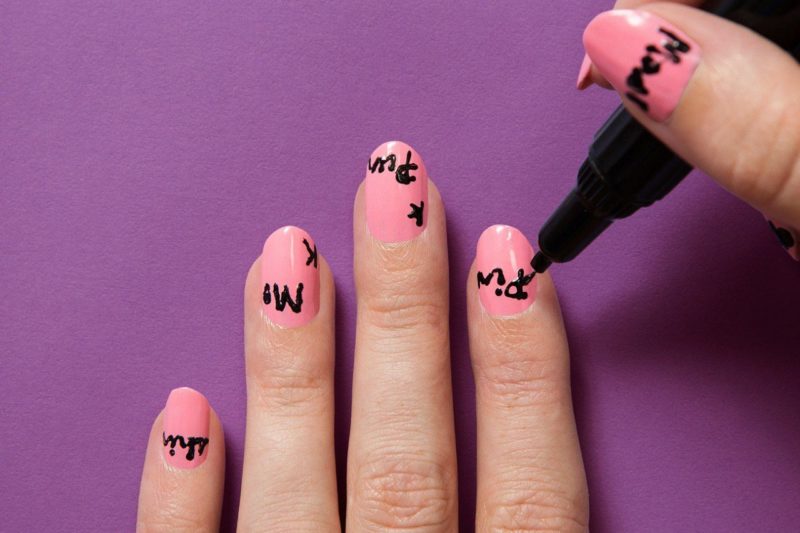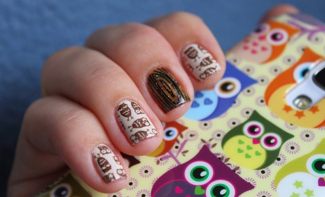 Используется техника стемпинг. Для этого нужны специальные пластины, с которых отпечатывается рисунок. Для девочек подходят растительные рисунки, животные и мультяшные герои, и узоры.