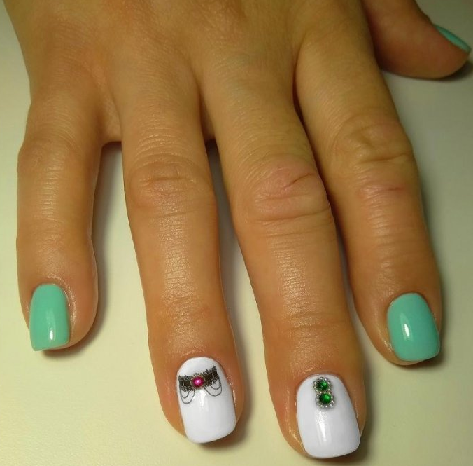 Не теряет популярности использование нежных оттенков лака в качестве основы. Для придания шикарности можно использовать блестки в верхней части ногтя в качестве вензеля.