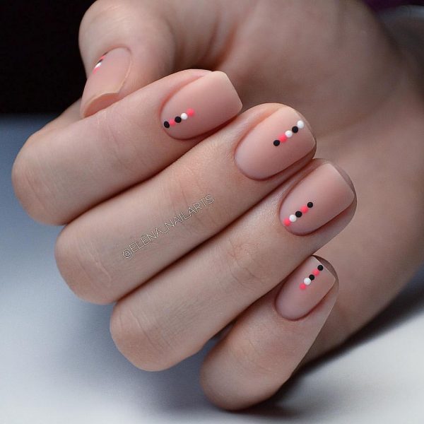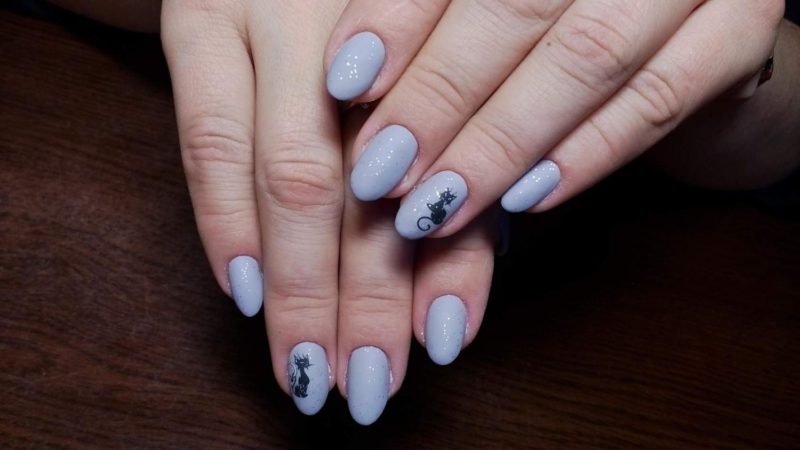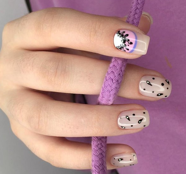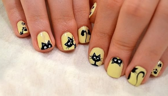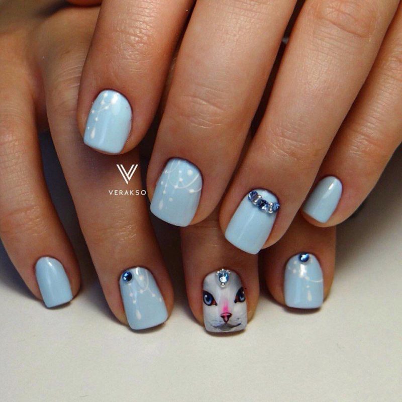 - На все ногти наносится прозрачное покрытие, рисуются мордочки кошек и оставшаяся часть украшается разноцветными точками.