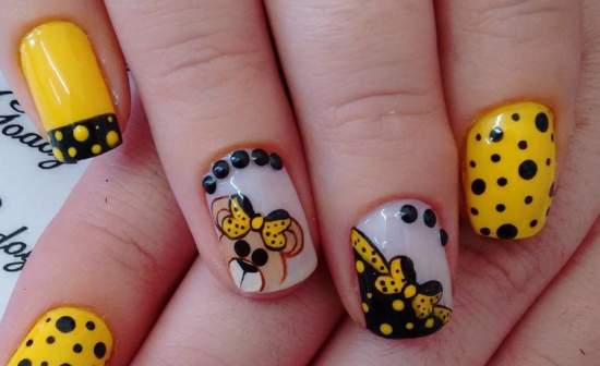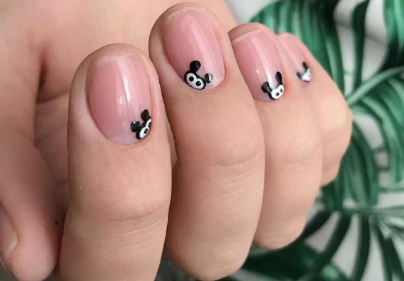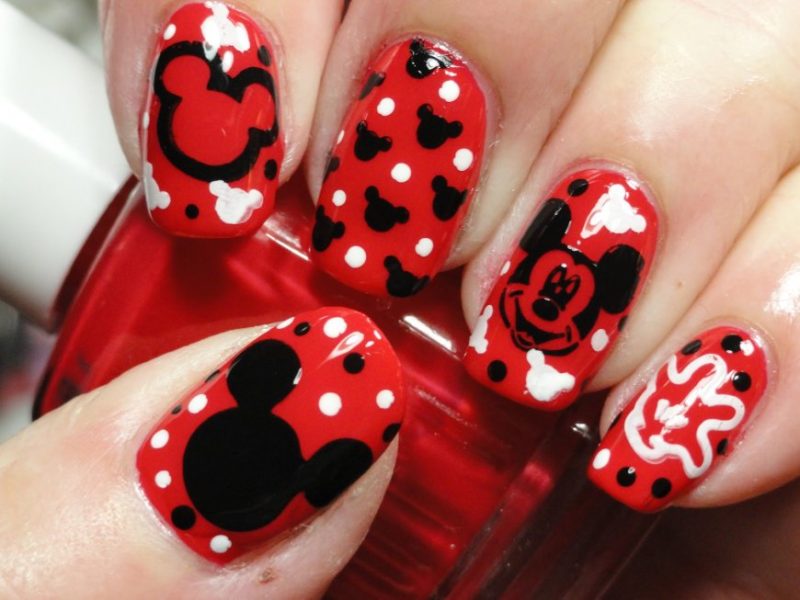 - Маникюр в стиле Микки Мауса. На ногти наносятся мордочки популярных героев, на другие всеми известные ушки, на следующие бантик Минни. Получается очень ярко и сразу можно узнать из какого мультика.