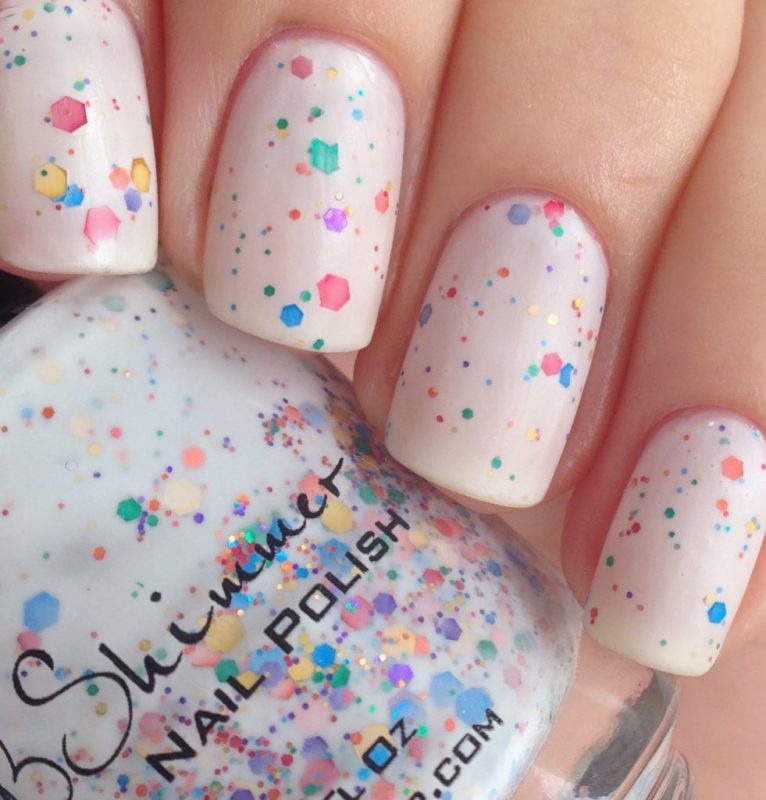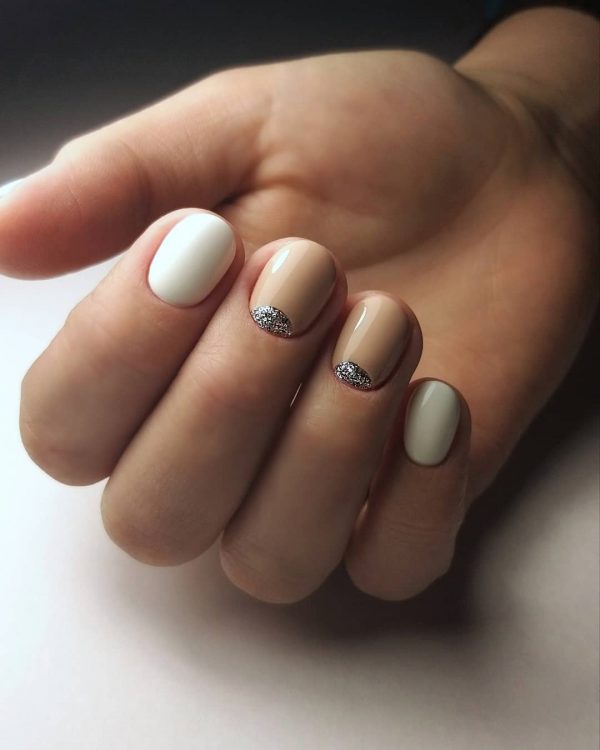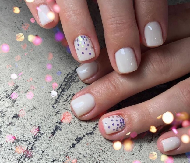 Вместо разнообразных рисунков используются блестки. Они не останутся без внимания, но в то же время оставят маникюр нежным и аккуратным.