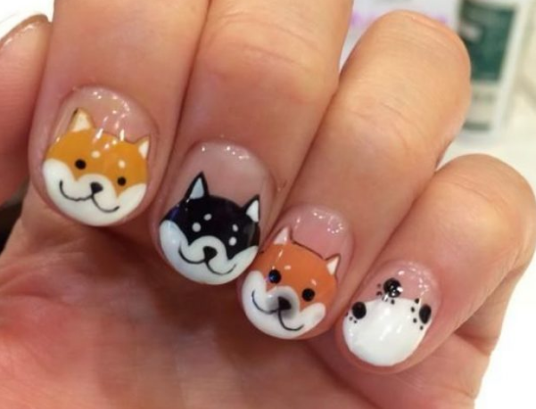 - На разноцветные ногти наносят мордочки собак. Можно использовать разноцветную основу.