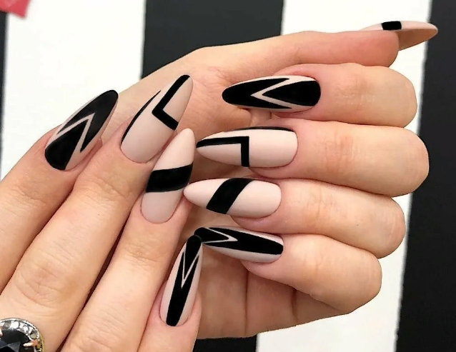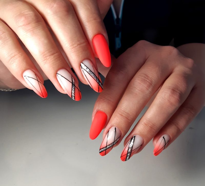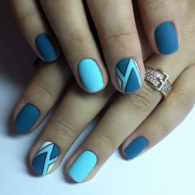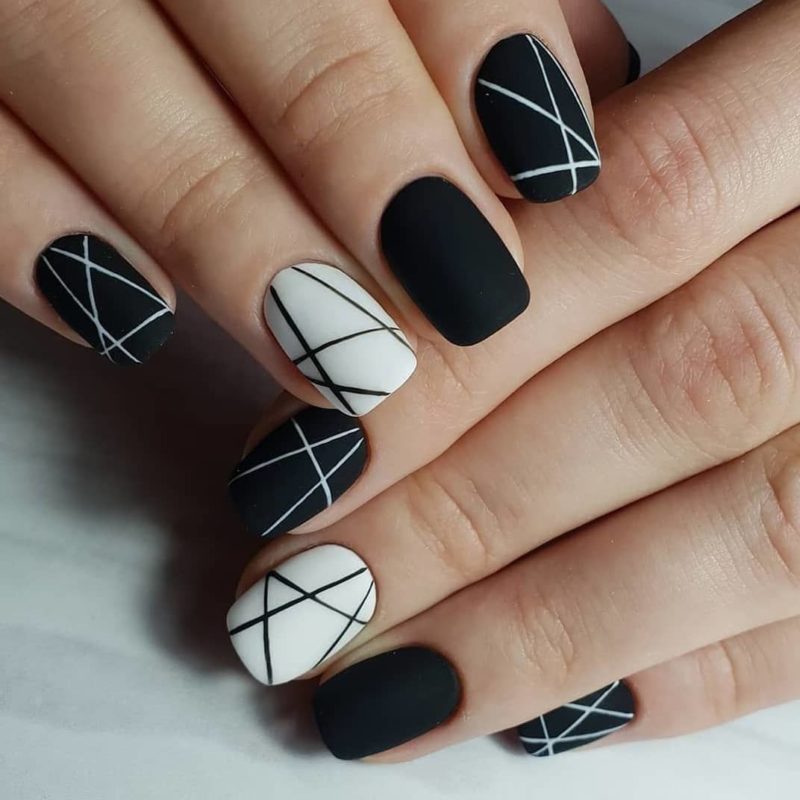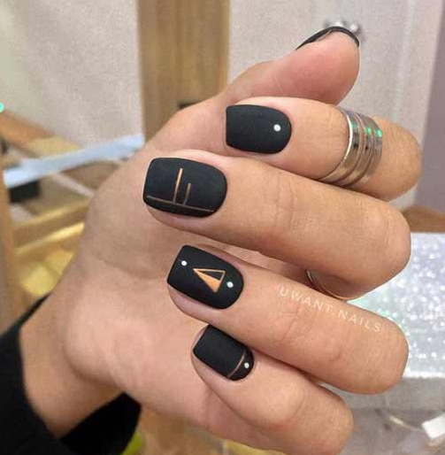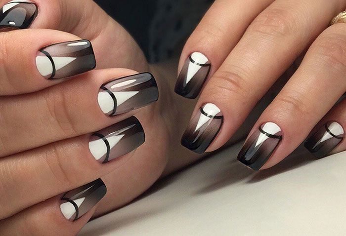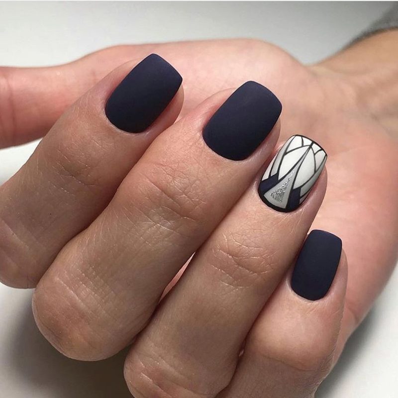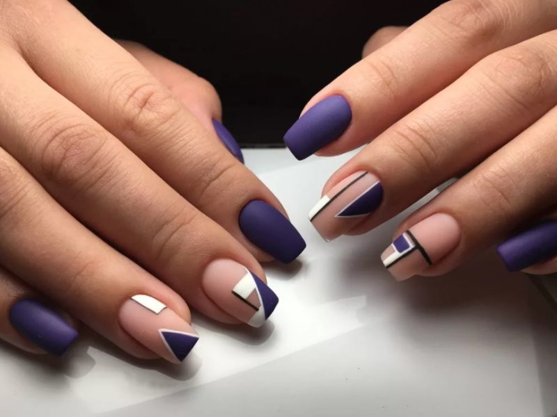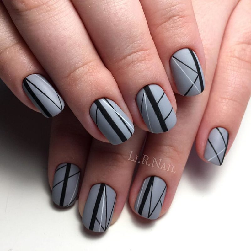 Классический дизайн маникюра смотрится привлекательно. Вовсе не обязательно создавать и яркие рисунки, чтобы привлечь внимание к своим рукам. Геометрия в матовом дизайне уникальна. Дизайн ногтей «Графика» с использованием оттенков красного, бежевого, белого и черного не выходит из моды. Геометрия подходит под разную форму ногтей. Особенно эффектно будут смотреться контрастные сочетания, к примеру белые полосы на черном матовом фоне.