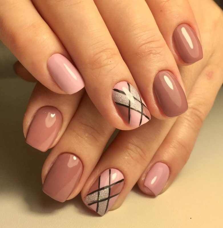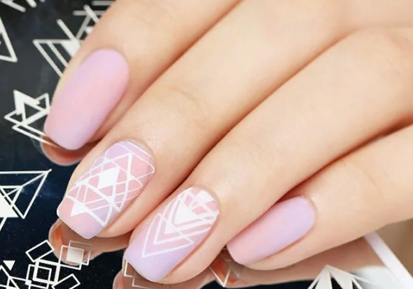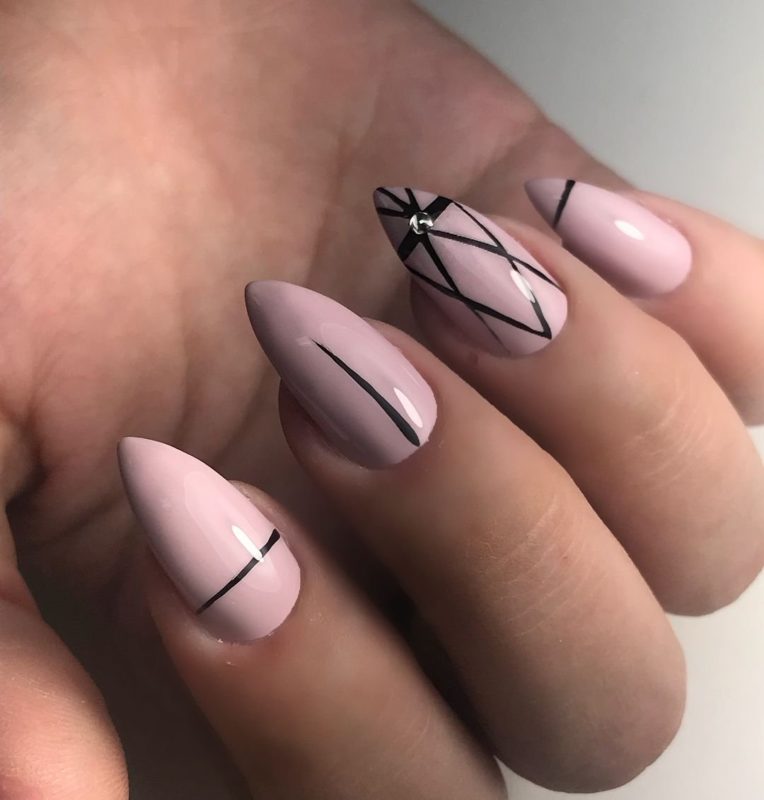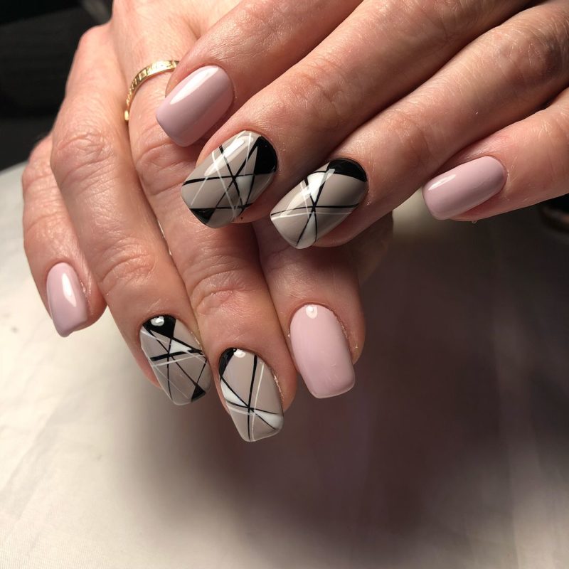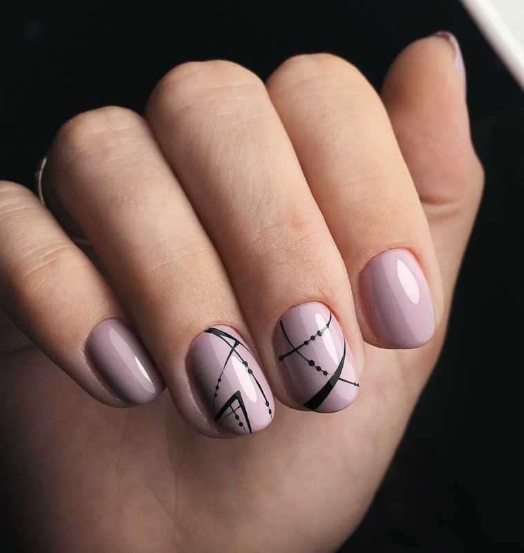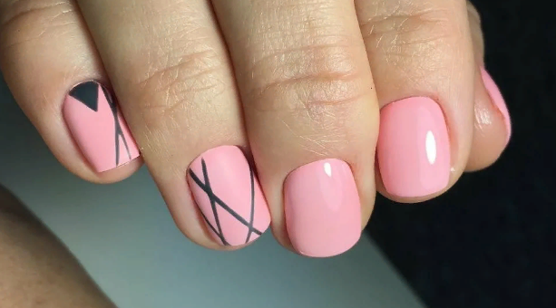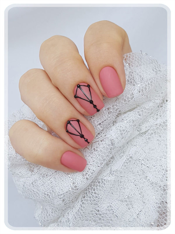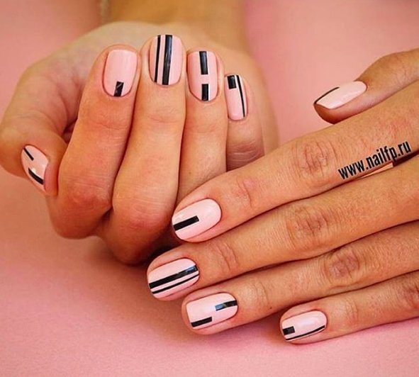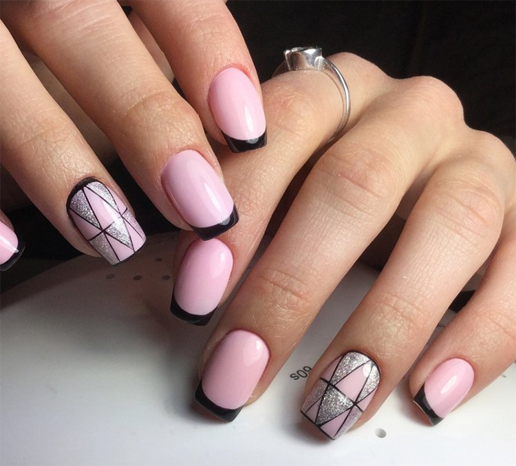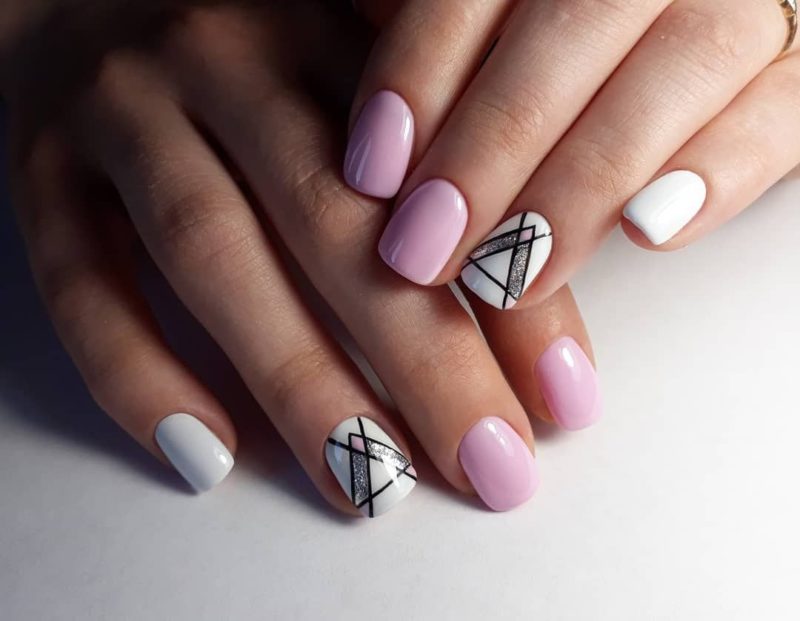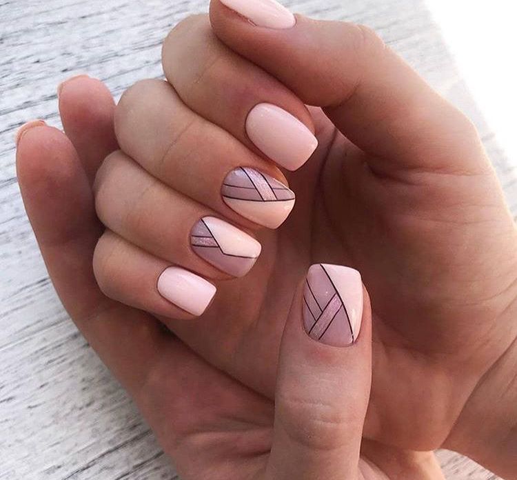 Совет: в работе не стоит допускать нажимов, движения нужно совершать легко. Геометрический маникюр на розовом фоне можно украсить стразами, элементами из фольги.