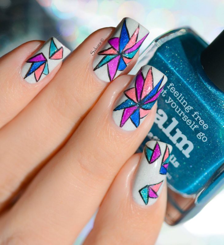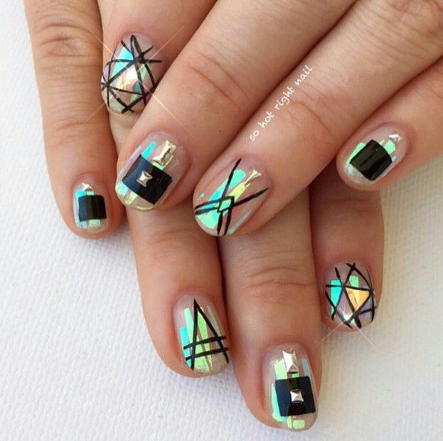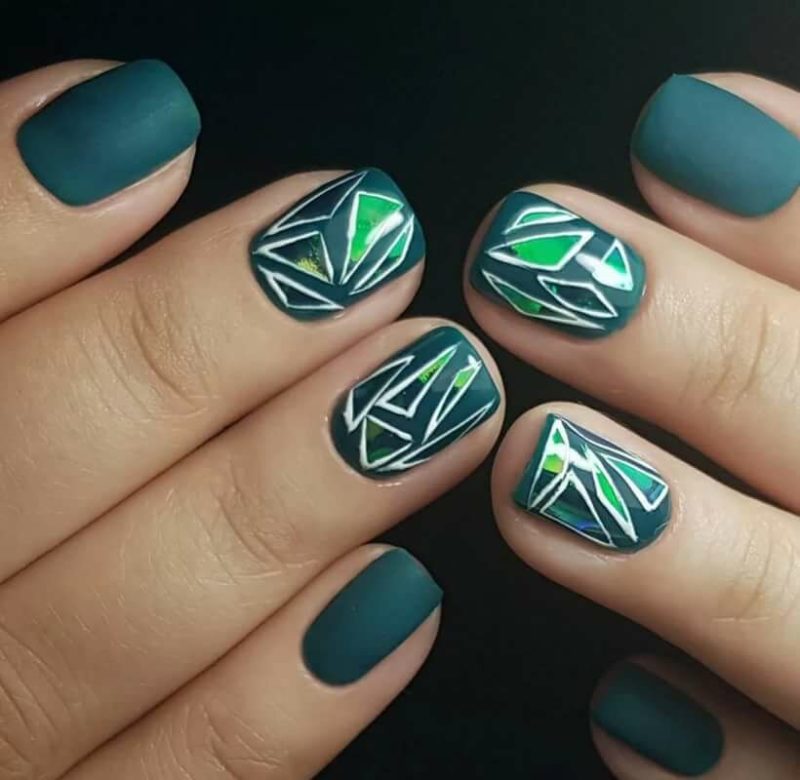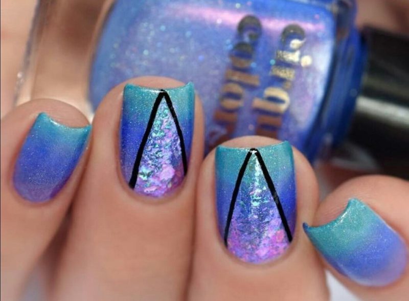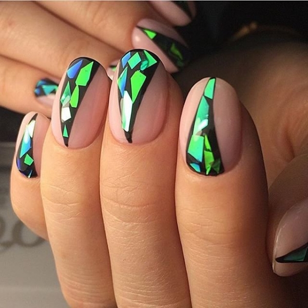 Чтобы получить яркий маникюр, надо применить фольгу, разрезать ее на несколько небольших кусочков треугольной формы, аккуратно уложить под поверхность лака. Эффект преломления света будет смотреться очень интересно. Маникюр-геометрия «Битое стекло» часто выполняют с использованием прозрачной основы, но можно выбрать и цветное покрытие.