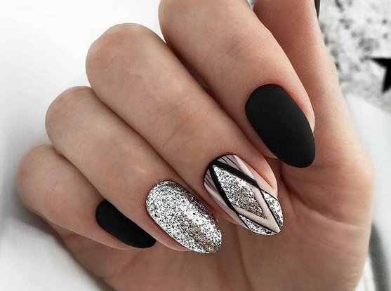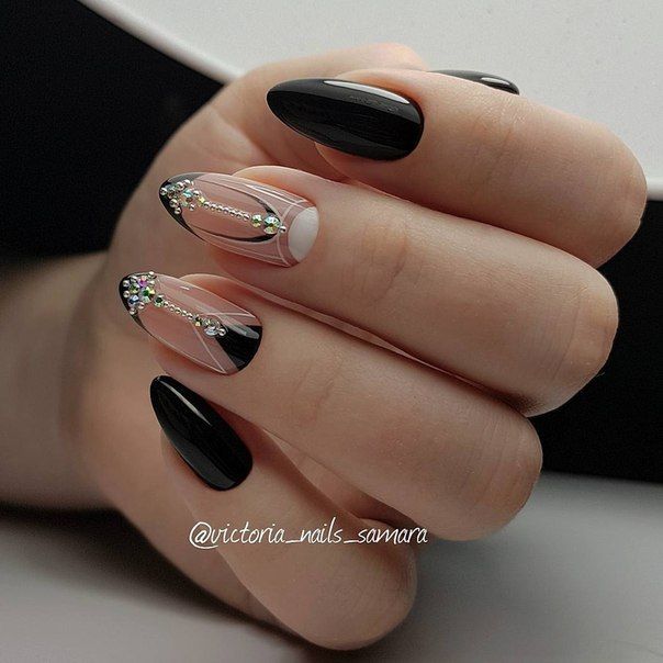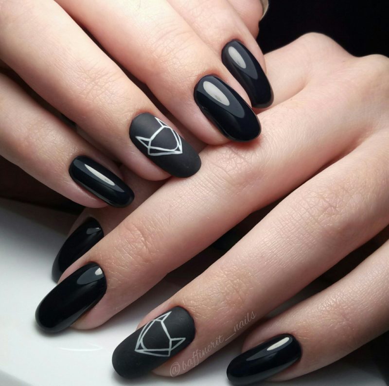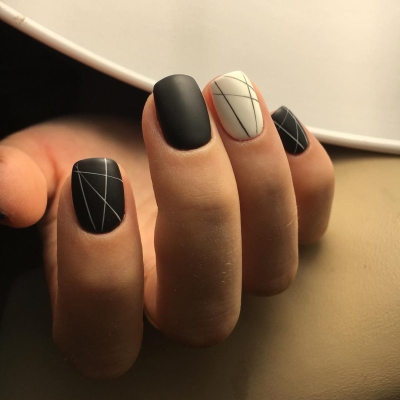 Отлично сочетается с белым, бежевым, серым, серебристым (тоже хороший вариант для абстрактной композиции). Дизайн с использованием черного цвета отлично подойдет к стильному вечернему платью, в целом, такой маникюр универсальный.