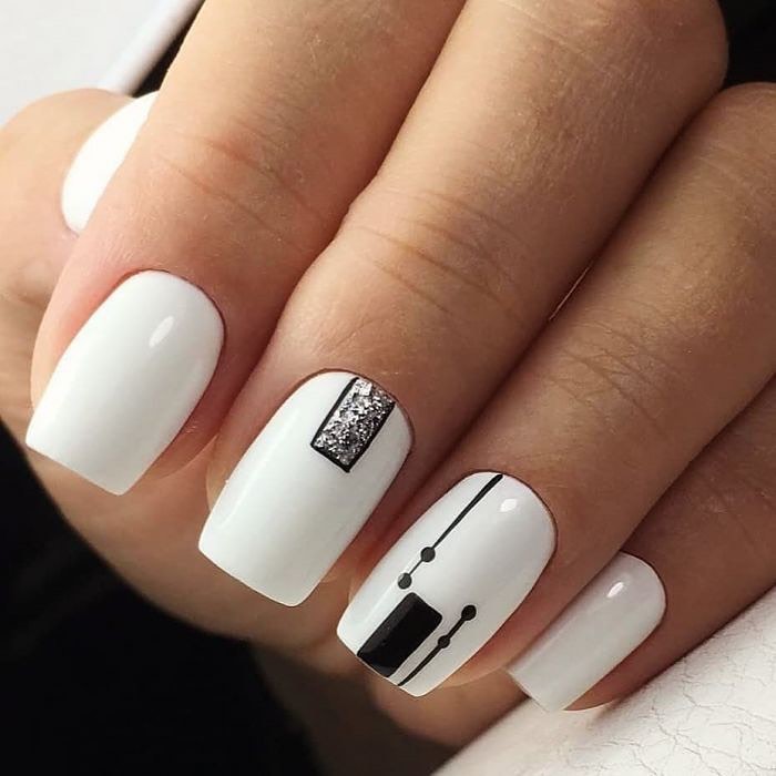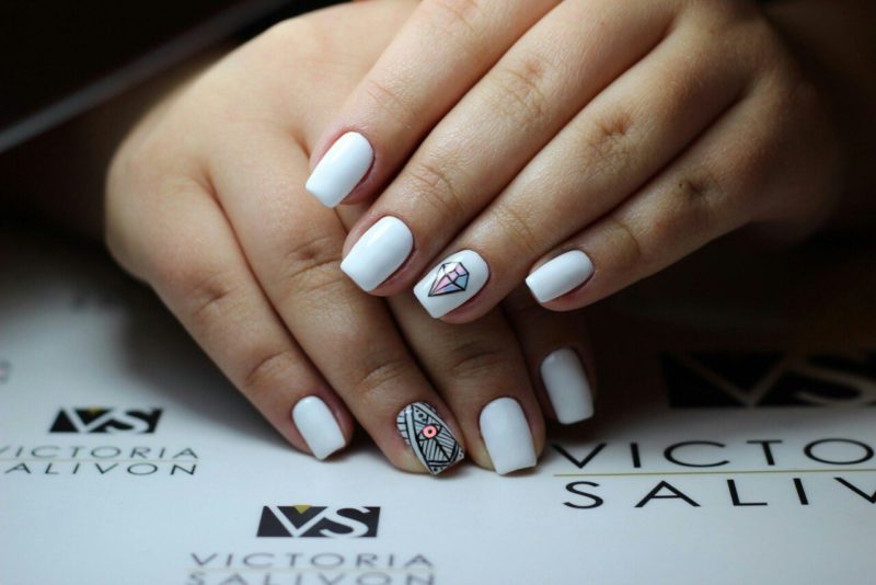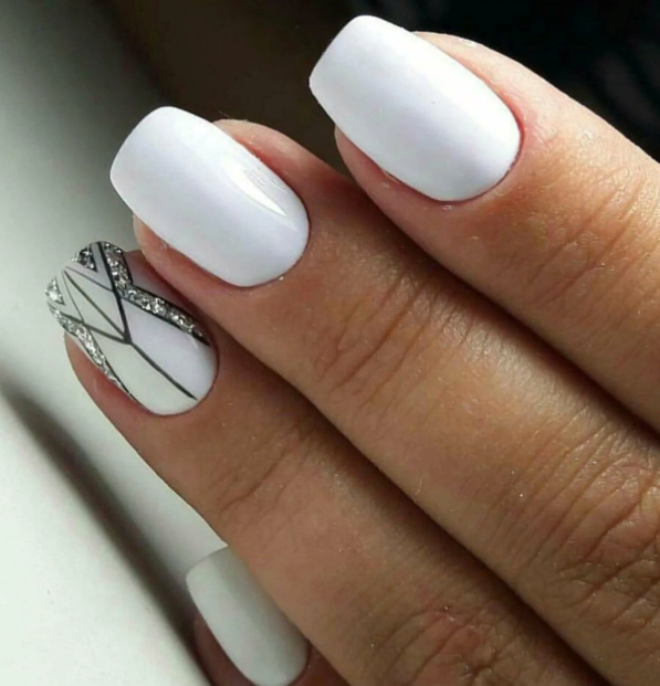 Белый цвет отлично сочетается с голубым, розовым, фиолетовым, серым, серебристым. Маникюр может быть выполнен в контрастных тонах или с сочетанием оттенков схожего цвета.