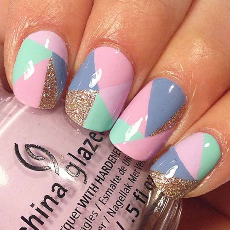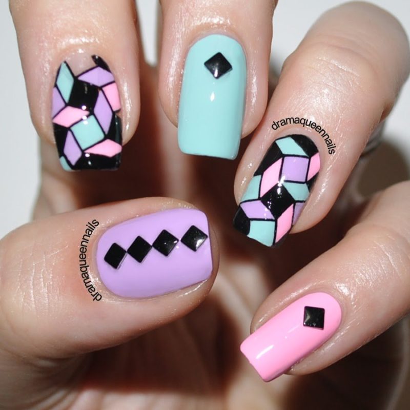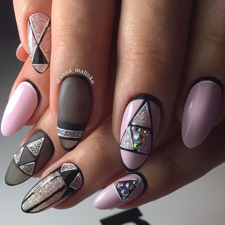 Геометрия на ногтях сочетается с ярким декором. Смело используйте камешки, стразы, блестки. В качестве декора можно выбрать абстрактный элемент, создать аппликацию в виде квадрата, ромба, треугольника.