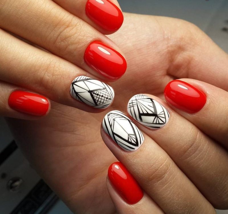 На красном фоне изображают асимметрию, хаотичные рисунки, оригинальные фигуры, линии, полосы. Этот цвет отлично подойдет для маникюра «Негативное пространство». Абстракцию рекомендуется рисовать на коротких или овальных ногтях.