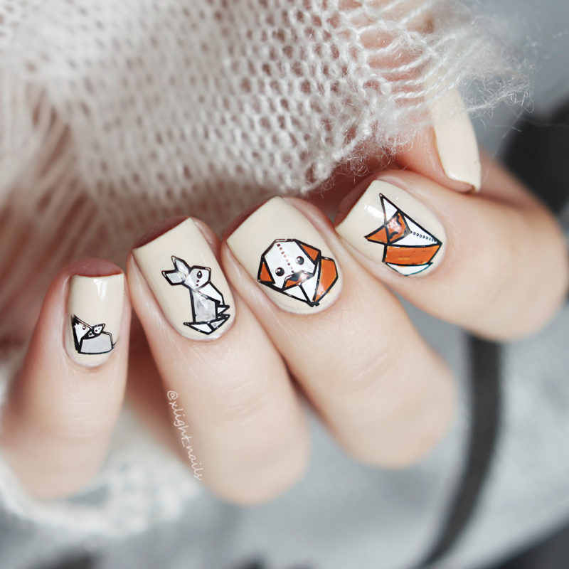 Один из видов нейл-арта в стиле геометрии называется «оригами». Базовый цвет – неяркий, на ногте несложная картинка. Маникюр изящный, однако, неброский. В качестве декора можно использовать простые полосы.