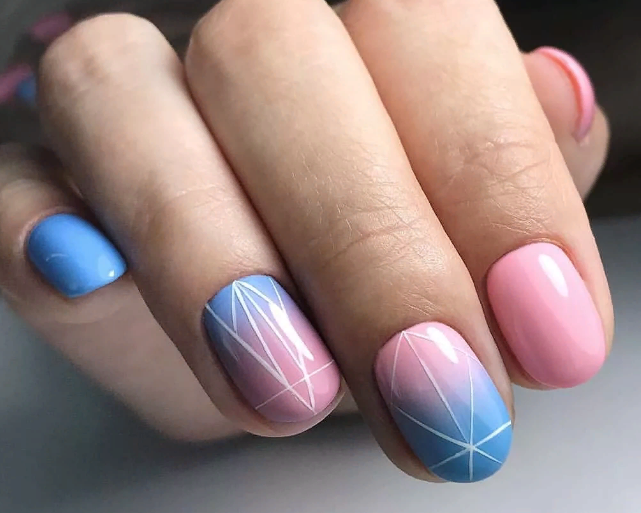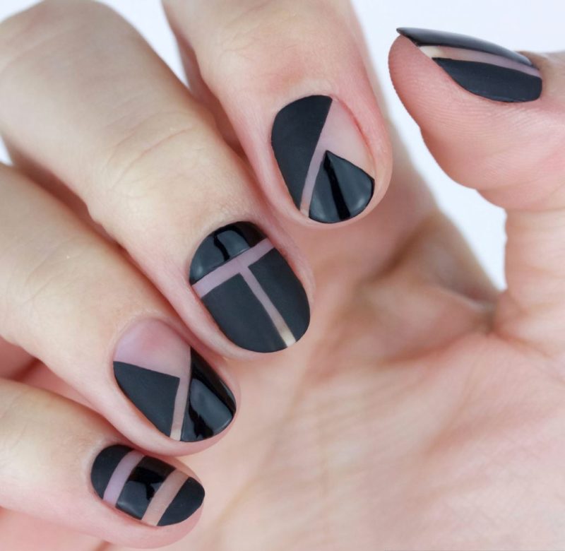 В нейл-арте есть множество идей дизайна. В маникюре «Негативное пространство» виден натуральный цвет ногтя, на лаковом покрытии – картинки. Применяют разноцветную палитру в такой геометрии, украшением является фольга. Чтобы создать эффект «Негативное пространство» надо использовать базу каучук или полупрозрачные виды лака.