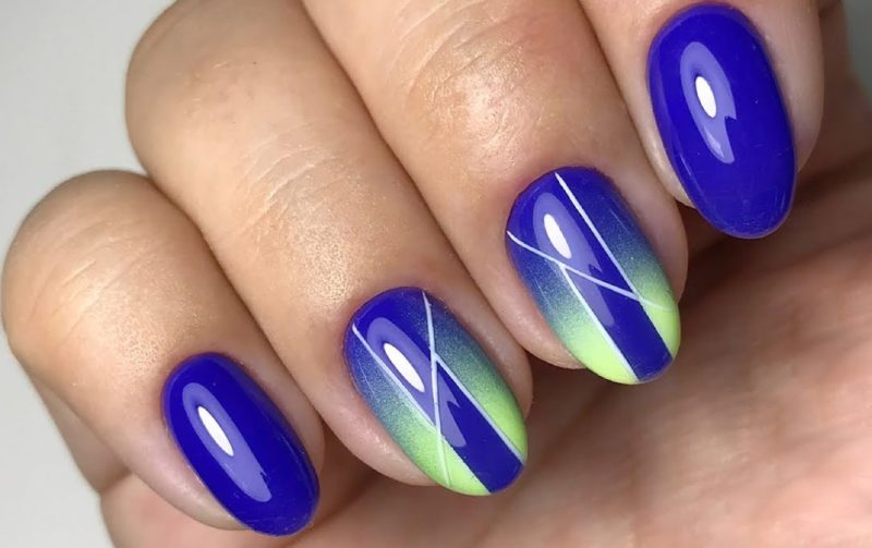 Градиент выполняют в насыщенных тонах, в качестве декора используют узоры, полоски, небольшие камешки. Утонченный дизайн «Геометрия омбре» представлен в разных вариациях. Плавный переход выглядит необычно. Ромбики на ногтях дополнят композицию. Маникюр в стиле омбре не останется без внимания! На ногтях создают композицию с сочетанием голубого, фиолетового, белого, зеленого, в качестве декора применяют блестки и камни.