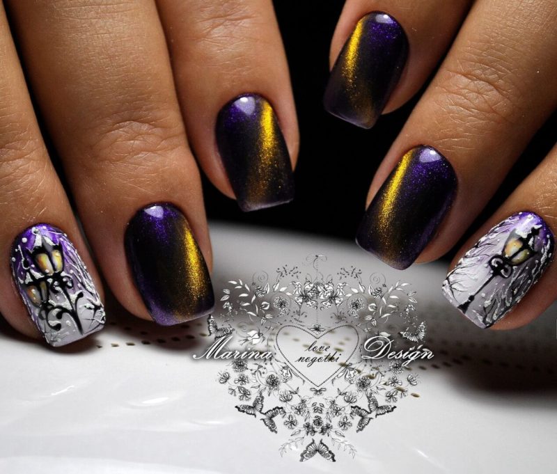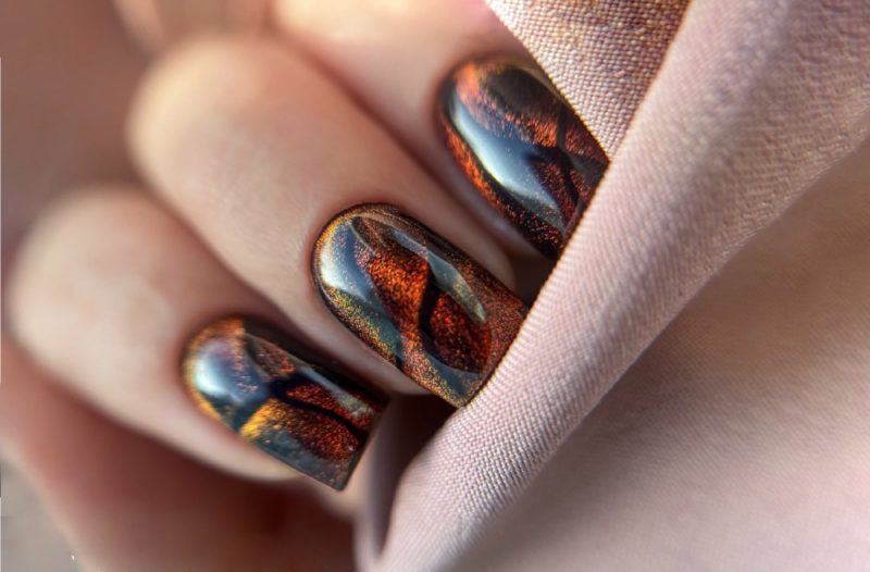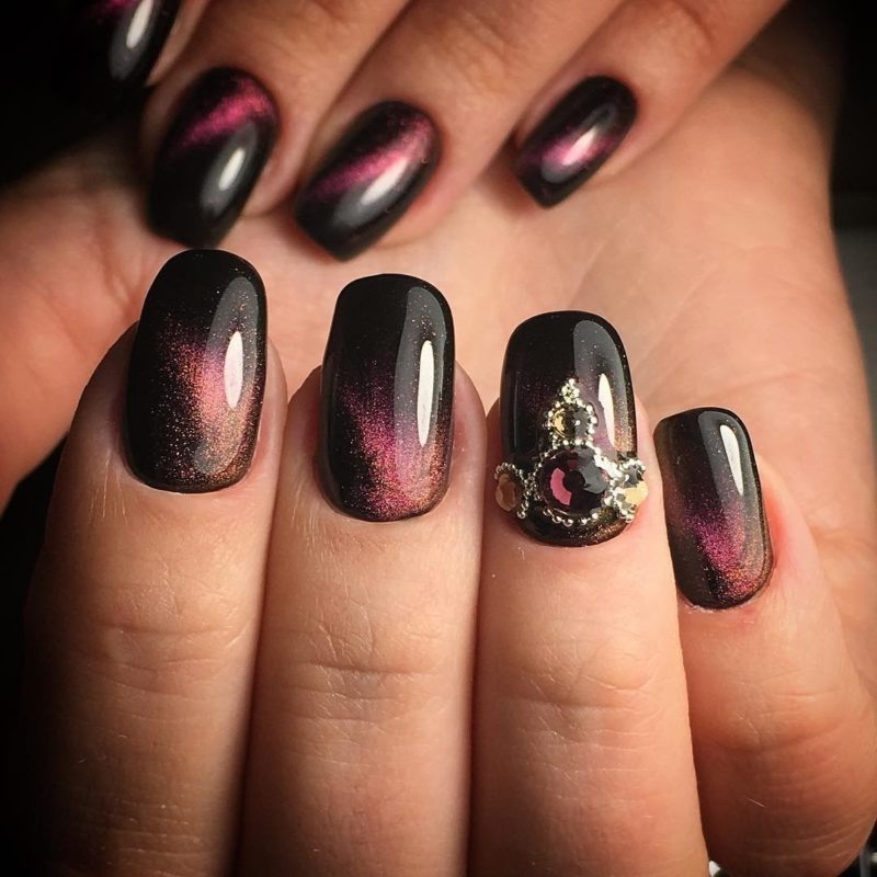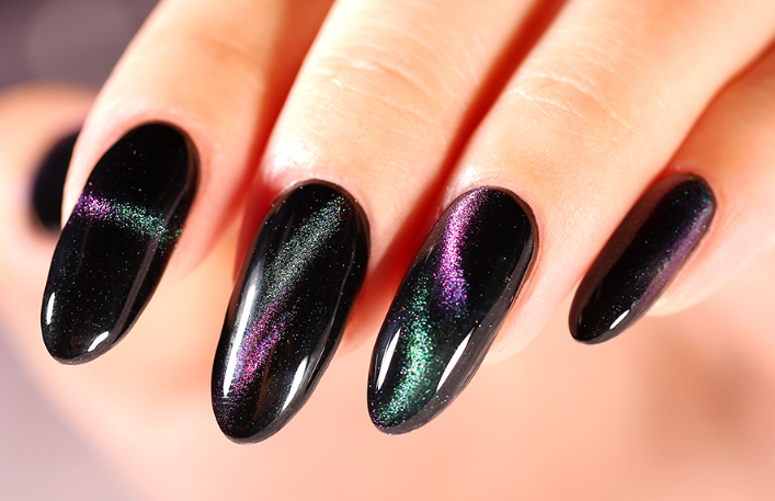 Основная особенность такого маникюра в применении специальных лаков, которые под воздействием магнитных волн и обеспечивают загадочные, но такие привлекательные переливы на ногтях. Это поистине впечатляющее изобретение нейл арта появилось сравнительно недавно — около семи лет назад и сразу же попала в топ идей для модного маникюра.