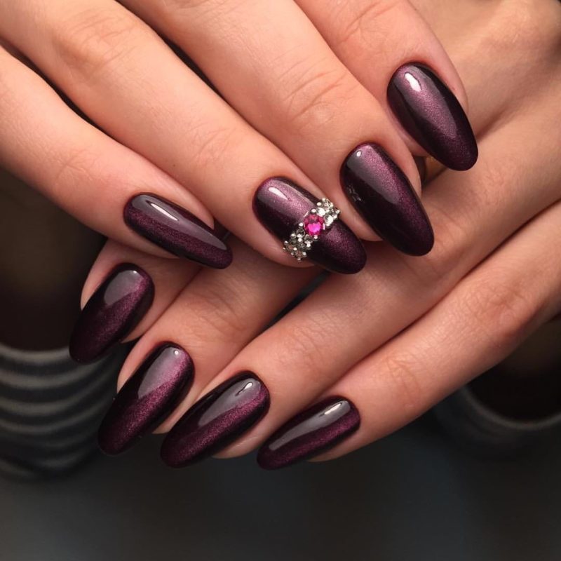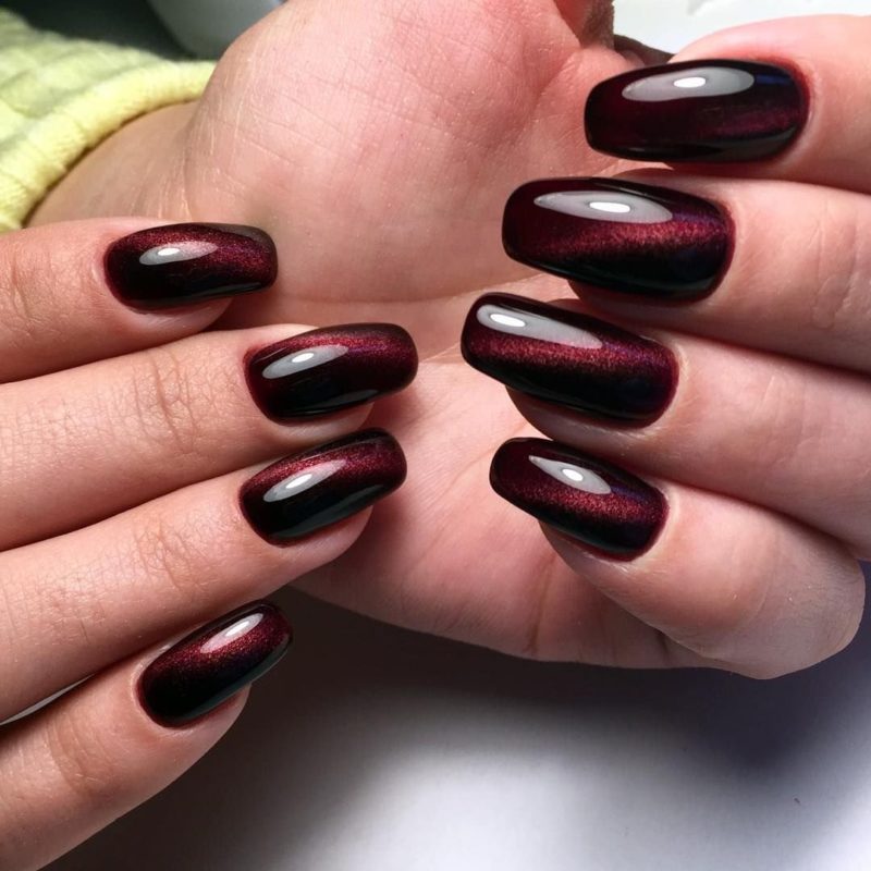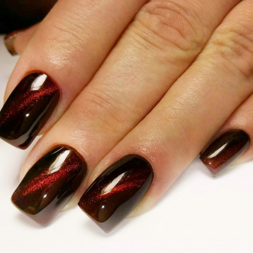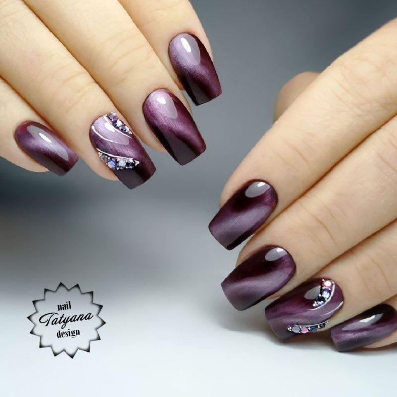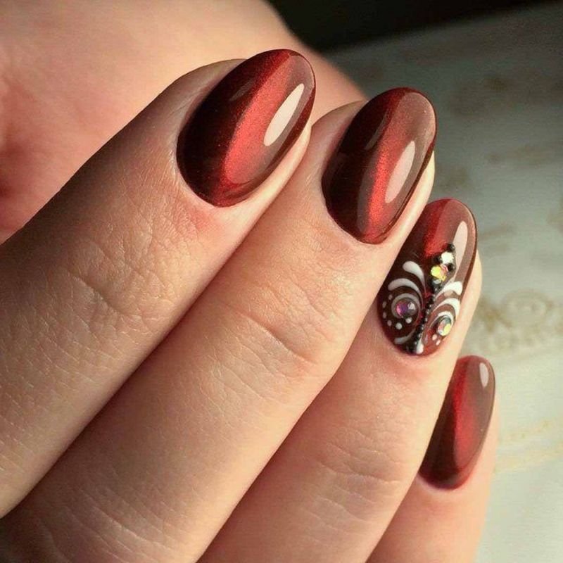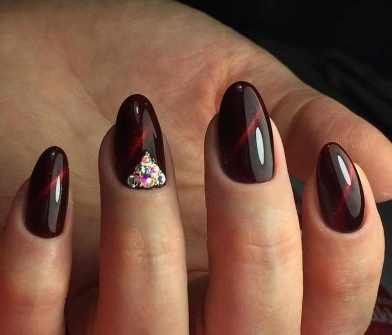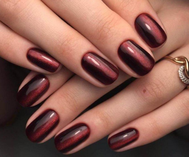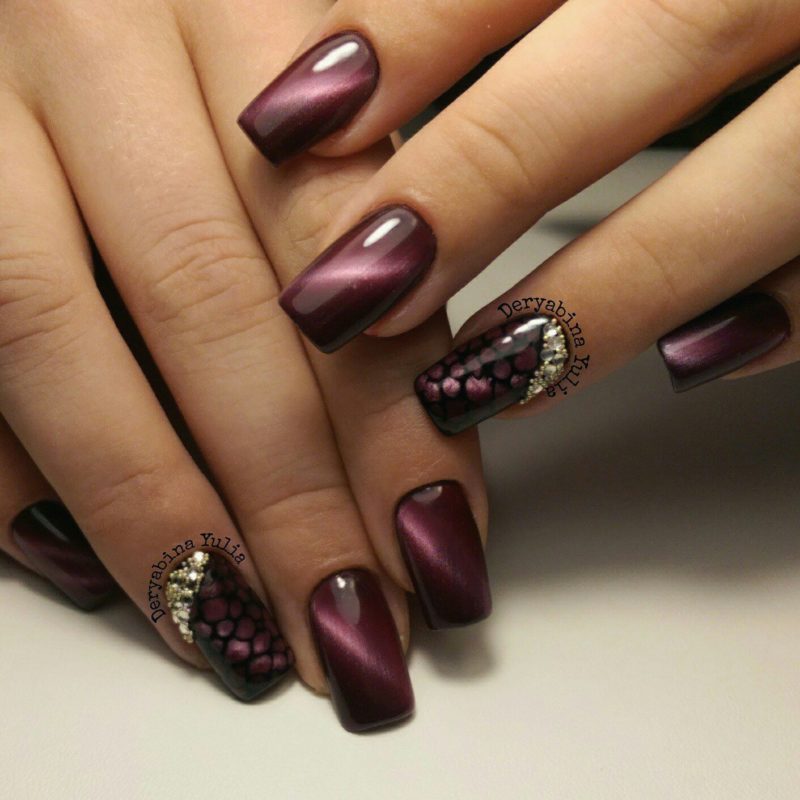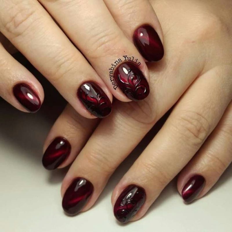 Бордо, винный, масала — все эти оттенки отлично подходят для уверенных в себе дам. Если хочется чего-то необычного, просто выбирайте магнитный лак. Это универсальный дизайн, который можно сочетать и с другими вариантами: