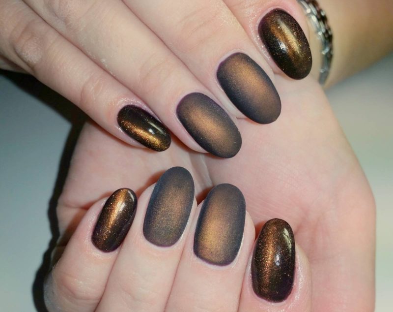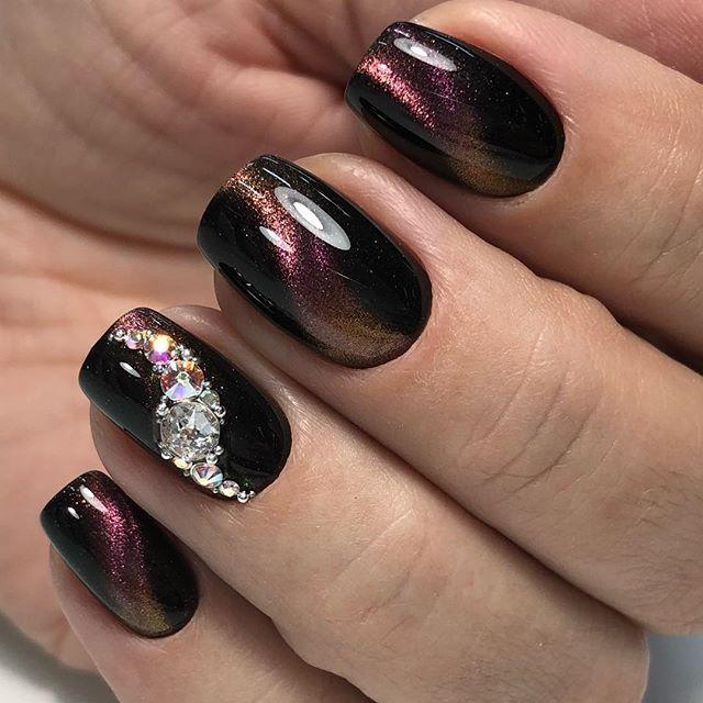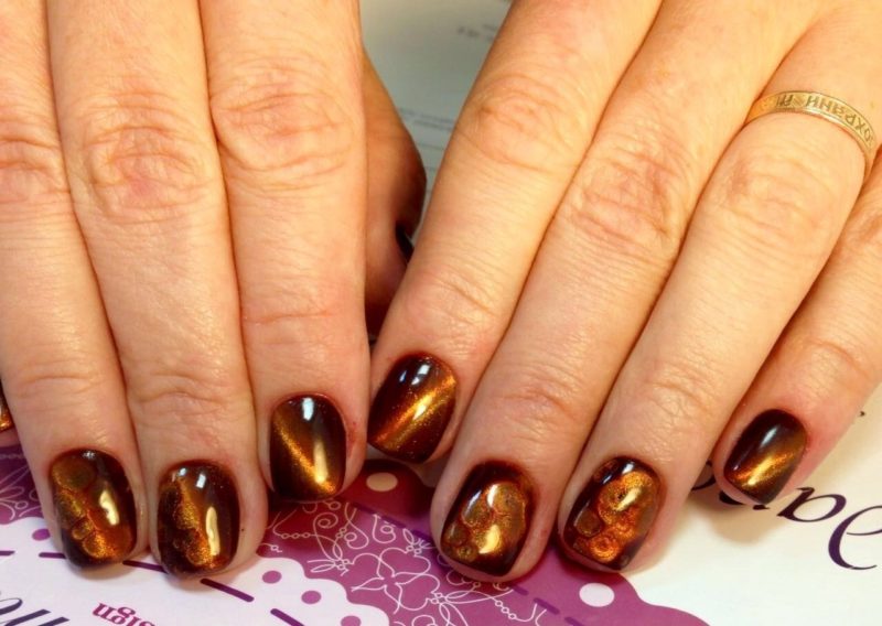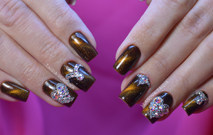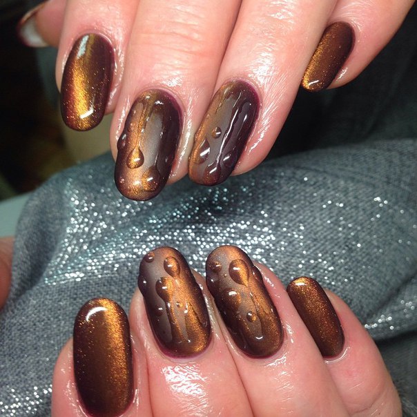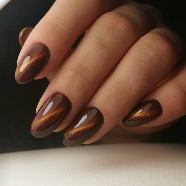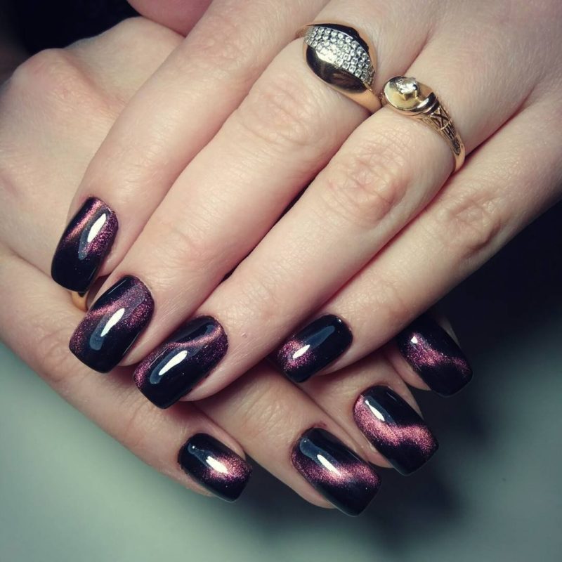 Темные оттенки лака давно перестали быть атрибутом неформалов. Но все же многие модницы с осторожностью относятся к черным и коричневым топам. Эффект кошачьего глаза заставит эти мрачные цвета заиграть новыми красками, показать новые грани. Теперь это уже не мрачные плоские фактуры, а драгоценные необработанные камни на ногтях.