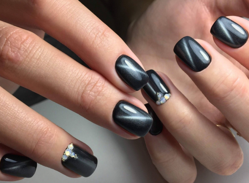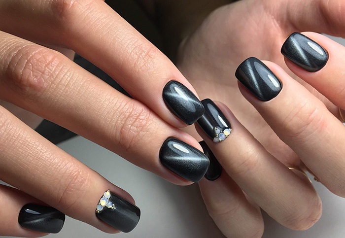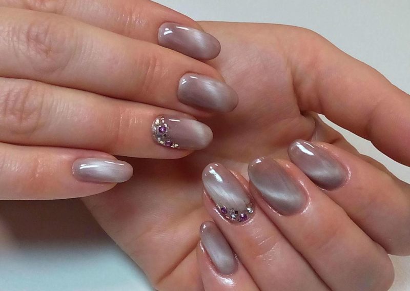Совет: серый маникюр в стиле кошачий глаз самодостаточен. Не стоит перекрывать его дополнительным декором.