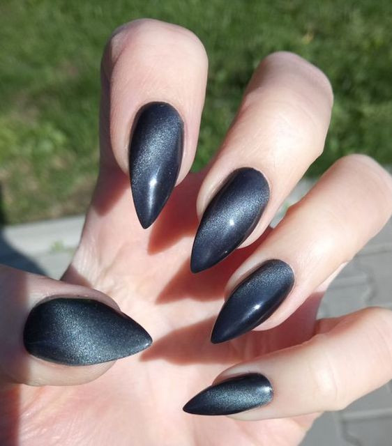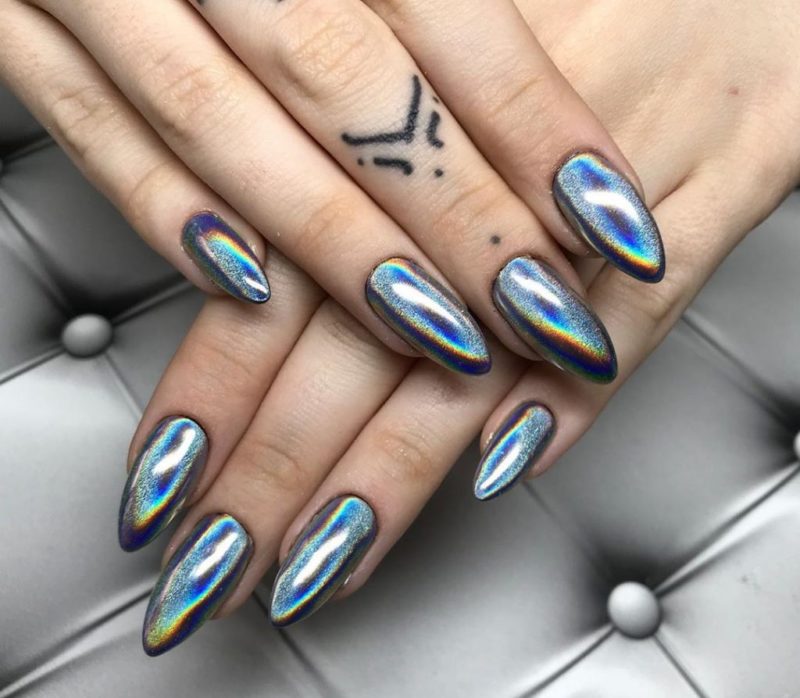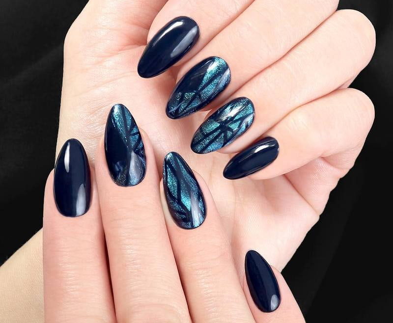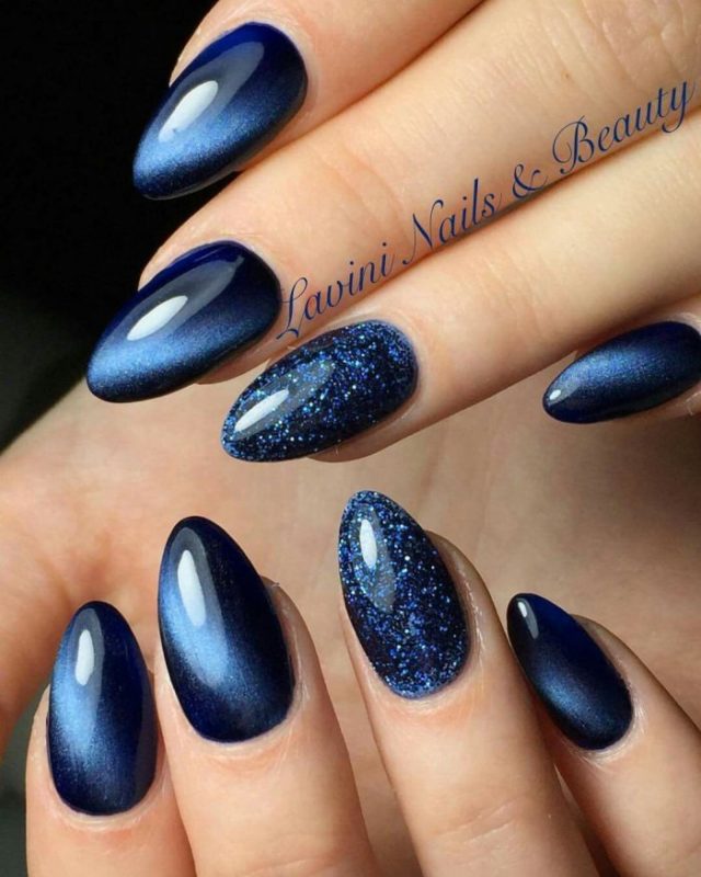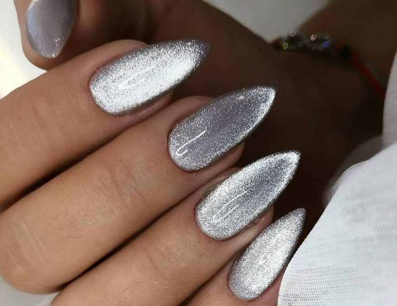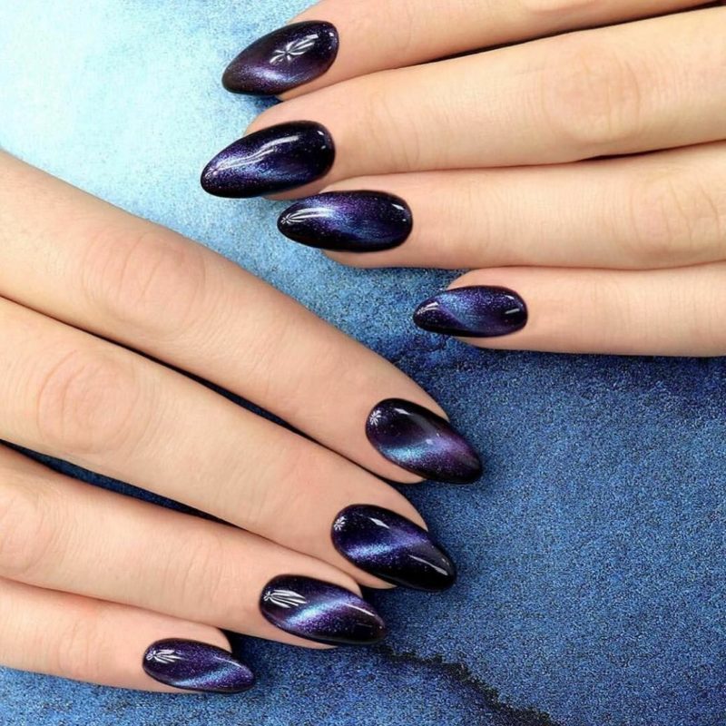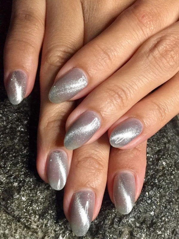 Миндальная форма ногтей просто создана для маникюра кошачий глаз. Вертикальные или диагональные переливы делают платину визуально длиннее. Руки получаются изящными, а пальчики тонкими.