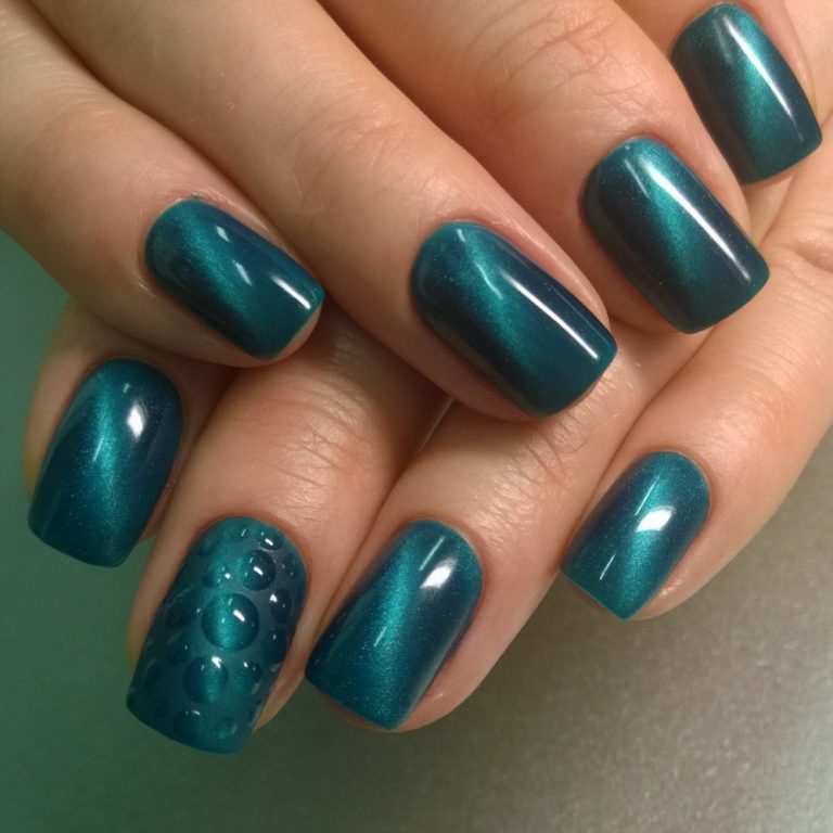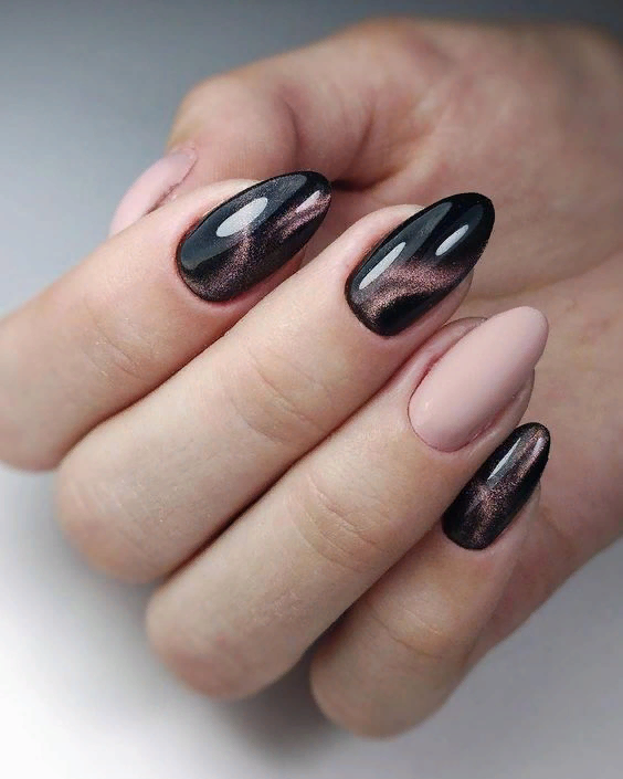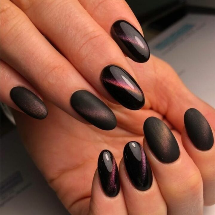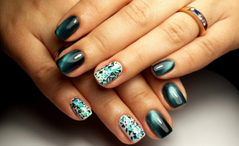 Фольга позволит сделать маникюр кошачий глаз более глубоким и эффектным. Вы можете дополнить магнитную основу декором из фольги или оформить отдельный ноготок, например, с матовой текстурой. Еще один вариант — чередование матового и глянцевого маникюра с эффектом кошачий глаз.