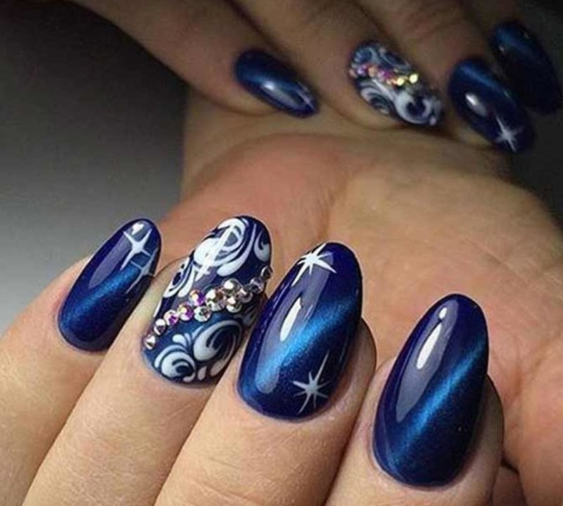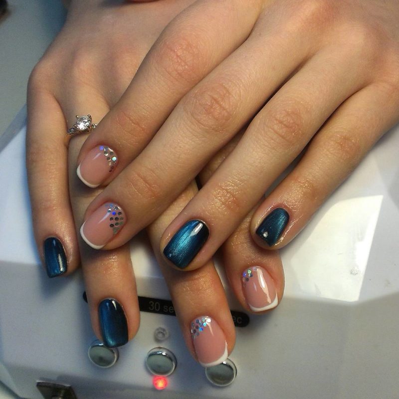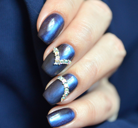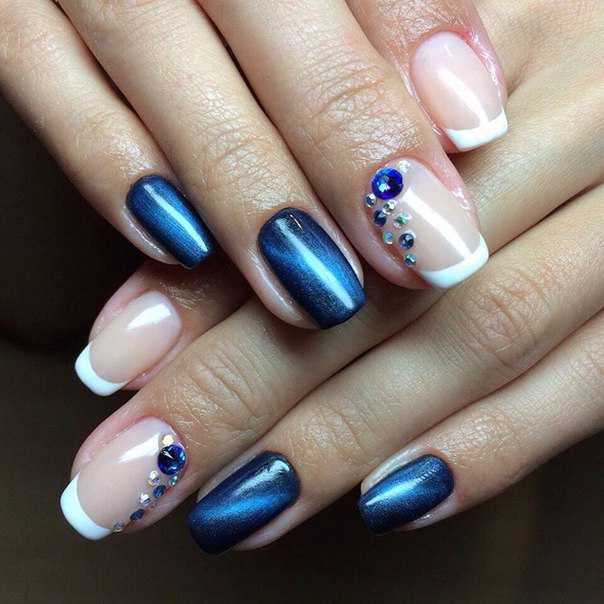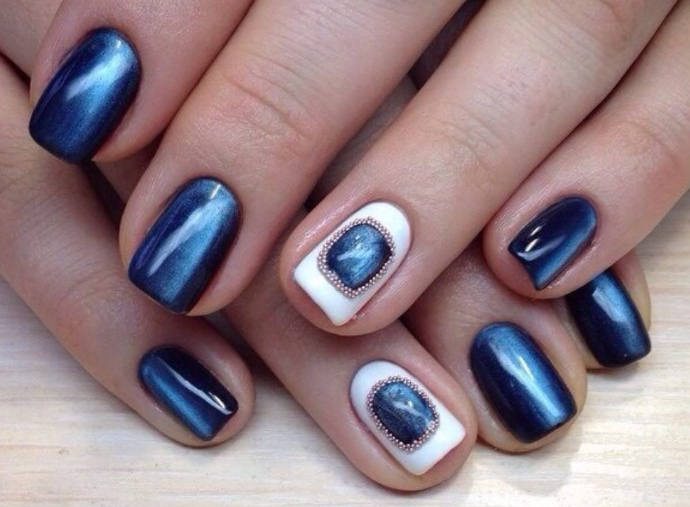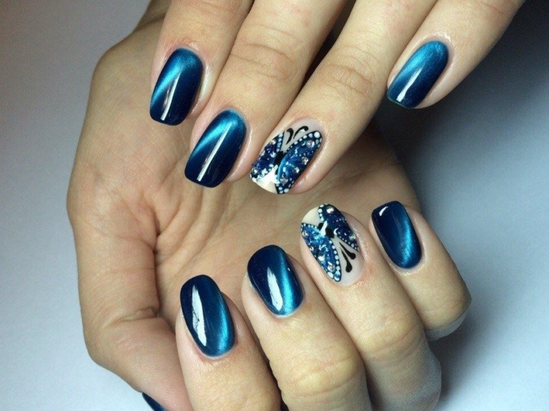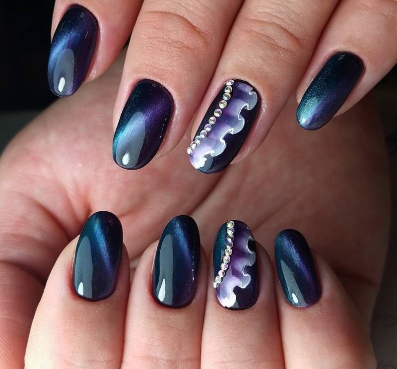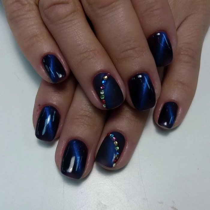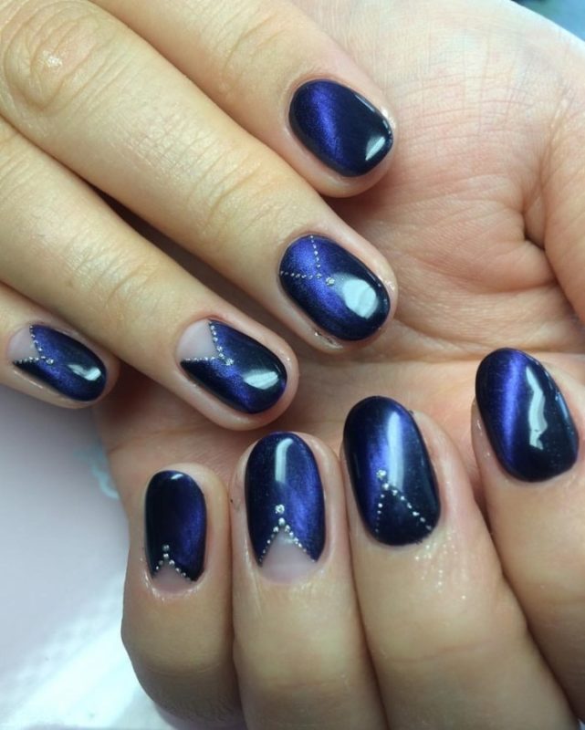 Синий магнитный состав позволяет создать на ногтях эффект переливающихся сапфиров. Для декора подойдет золотой и серебряный оттенки лака: френч, тонкие рисунки, стразы и блестки.