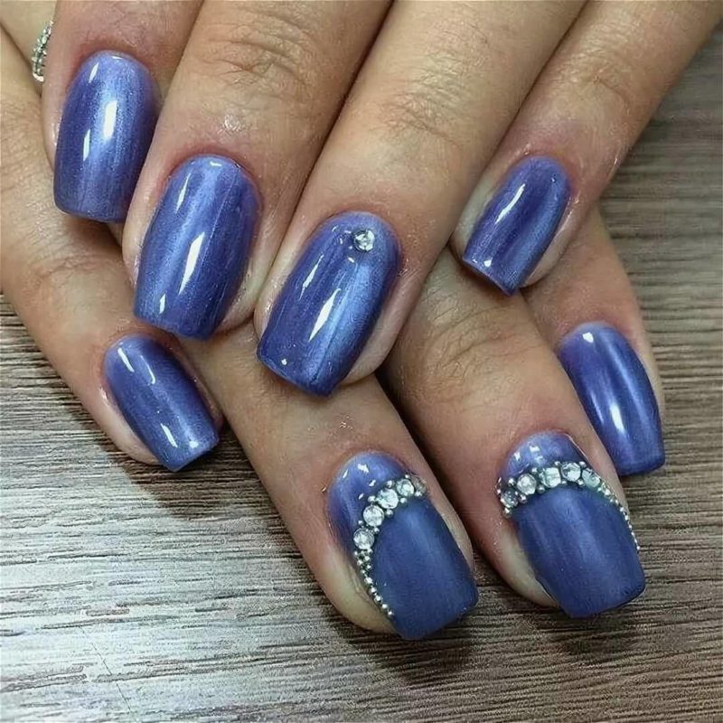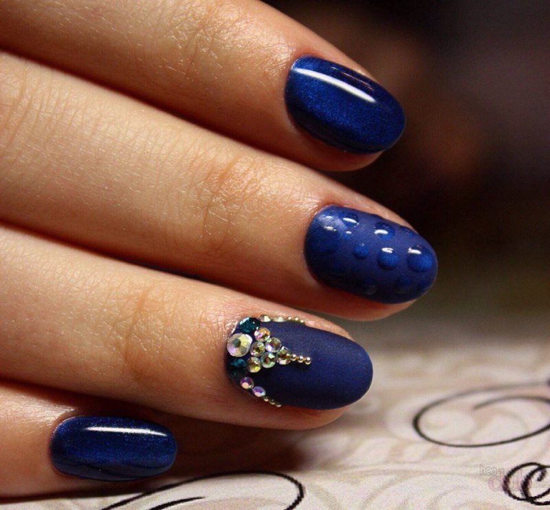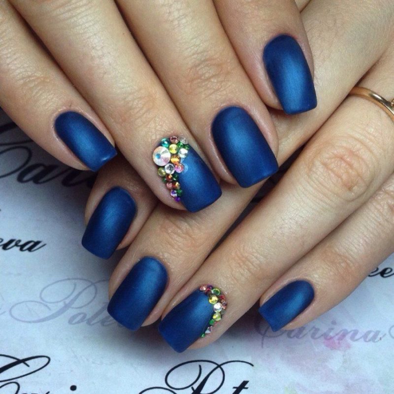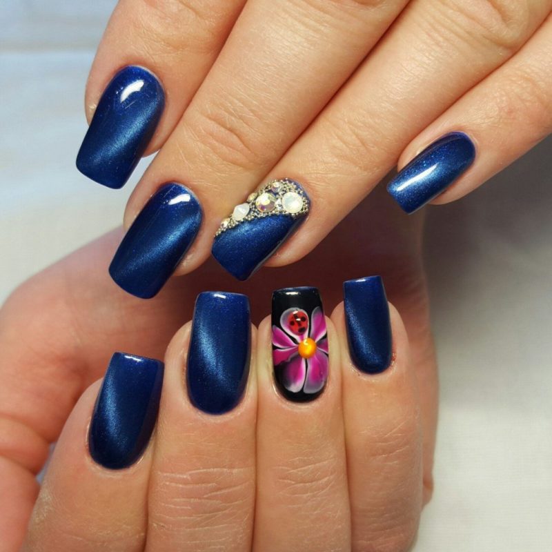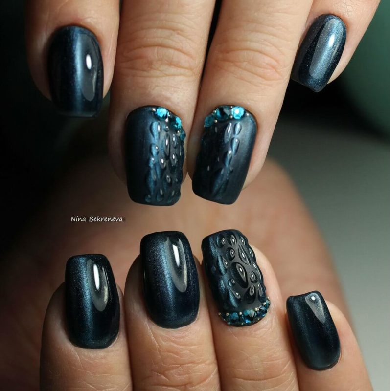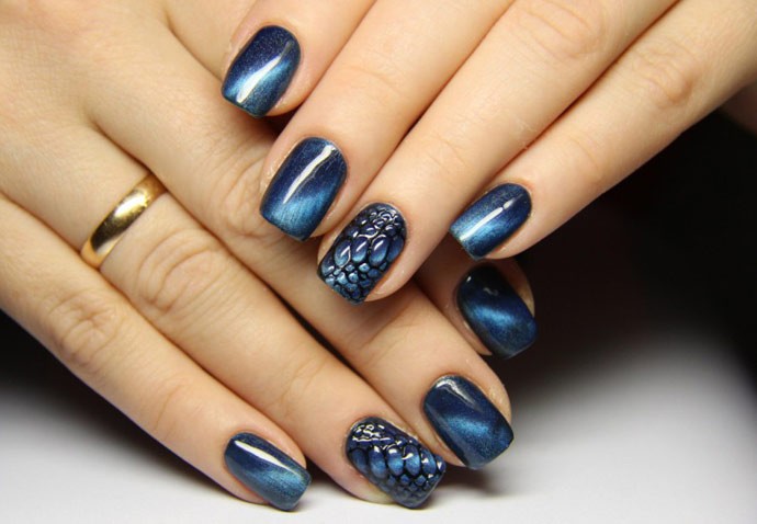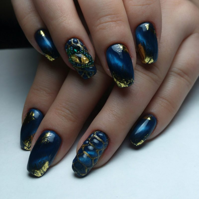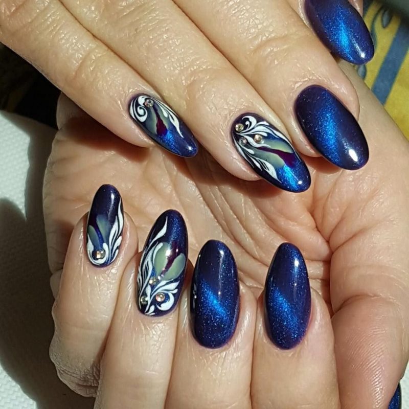 Синий магнитный состав позволяет создать на ногтях эффект переливающихся сапфиров. Для декора подойдет золотой и серебряный оттенки лака: френч, тонкие рисунки, стразы и блестки.