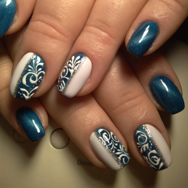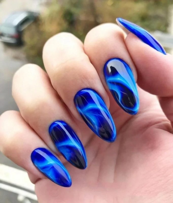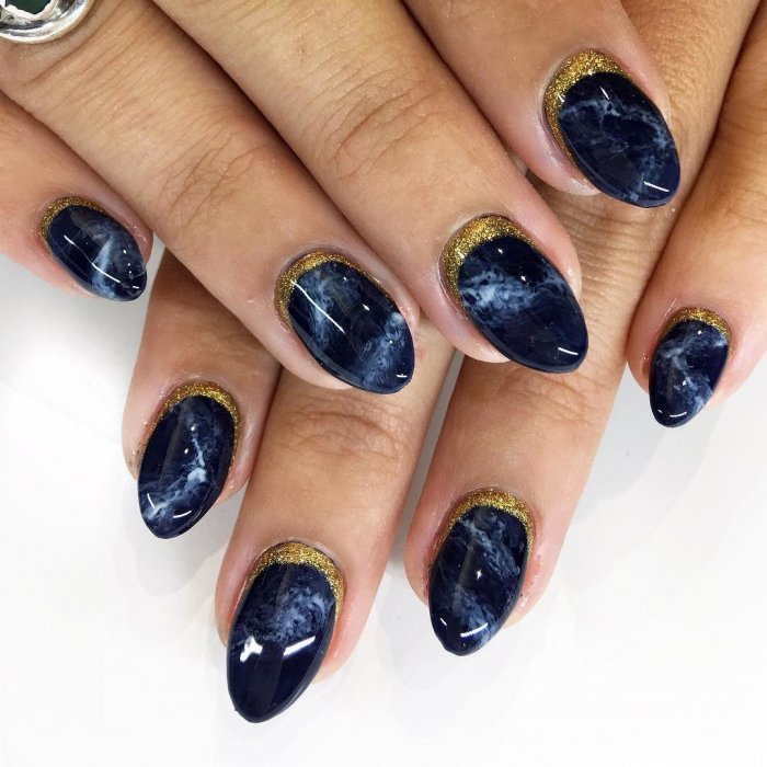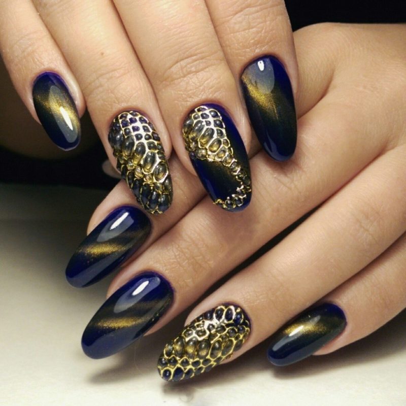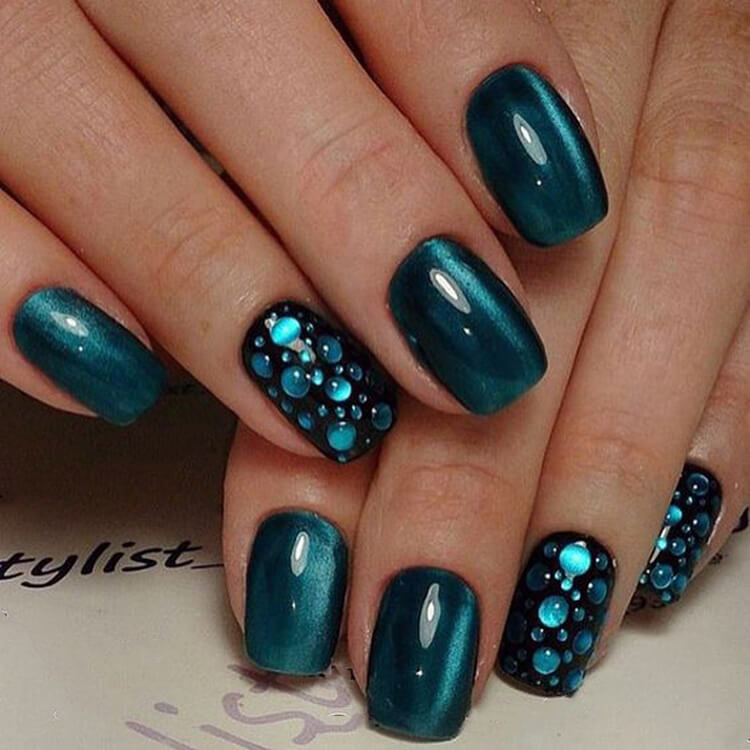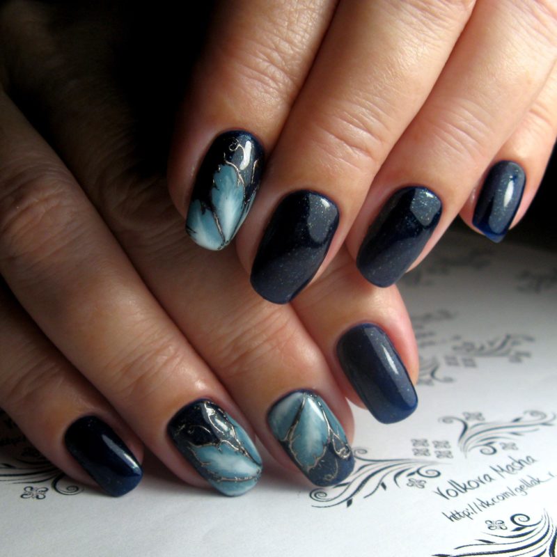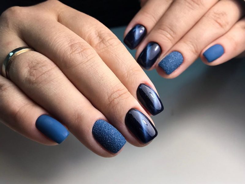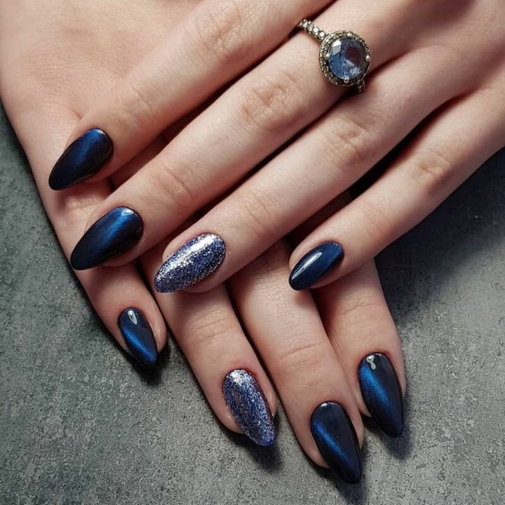 Синий магнитный состав позволяет создать на ногтях эффект переливающихся сапфиров. Для декора подойдет золотой и серебряный оттенки лака: френч, тонкие рисунки, стразы и блестки.