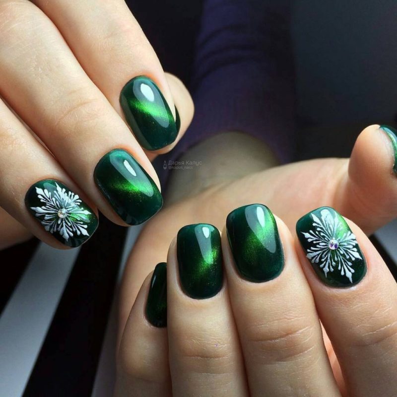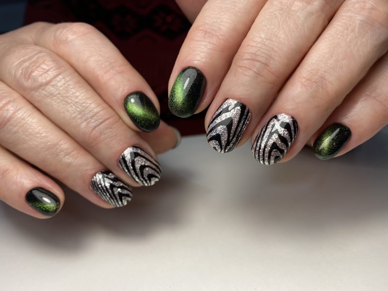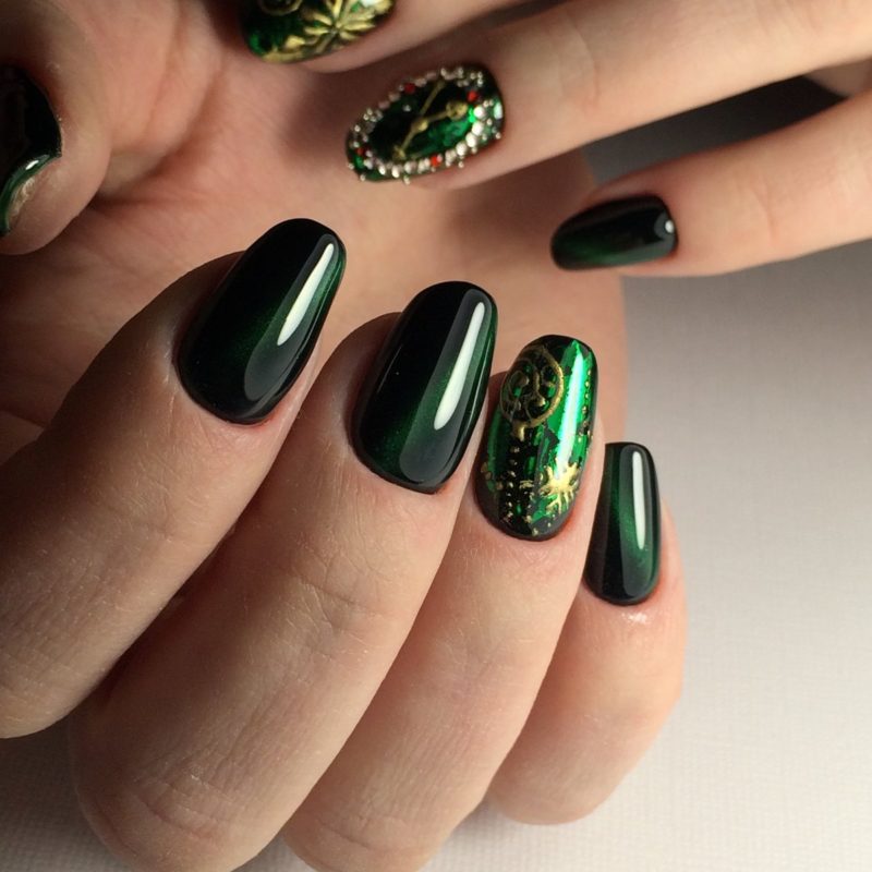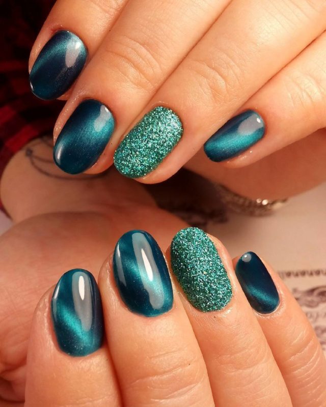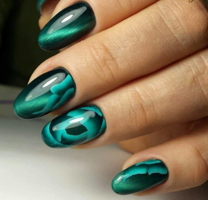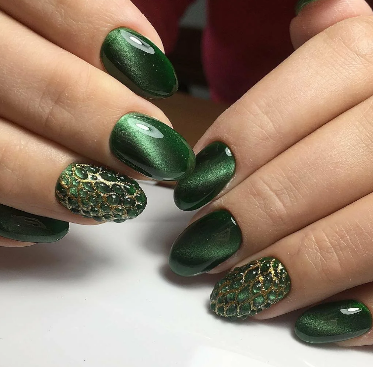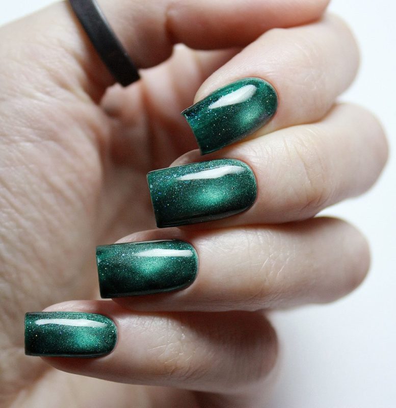 Зеленый — цвет который незаслуженно обходят стороной при создании модного маникюра. Кошачий глаз — это тот случай, когда зеленые оттенки раскрываются максимально полно. Это блестящий малахит или сверкающие сапфиры на ногтях. Обязательно попробуйте такой дизайн в новом сезоне.