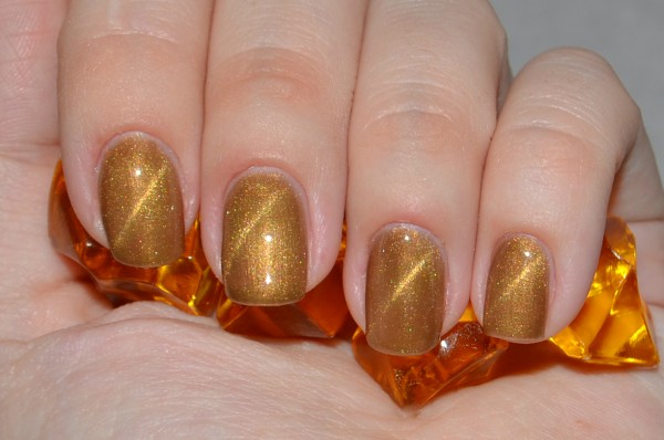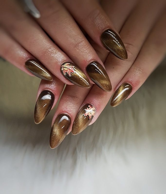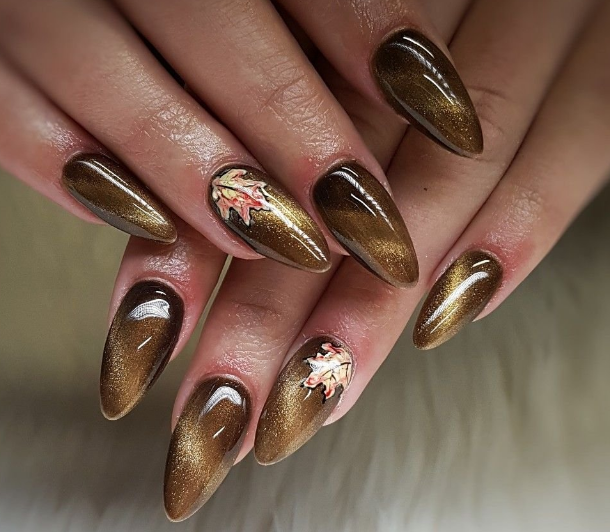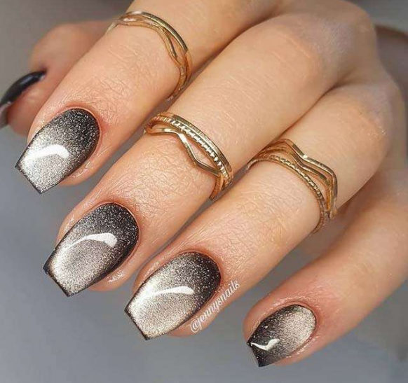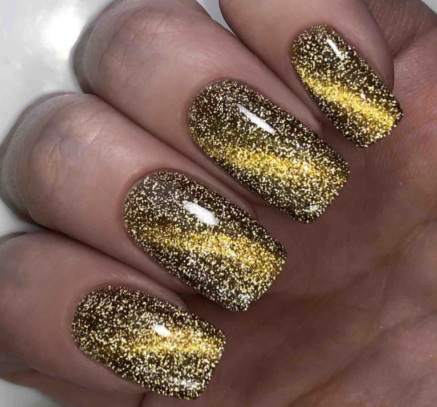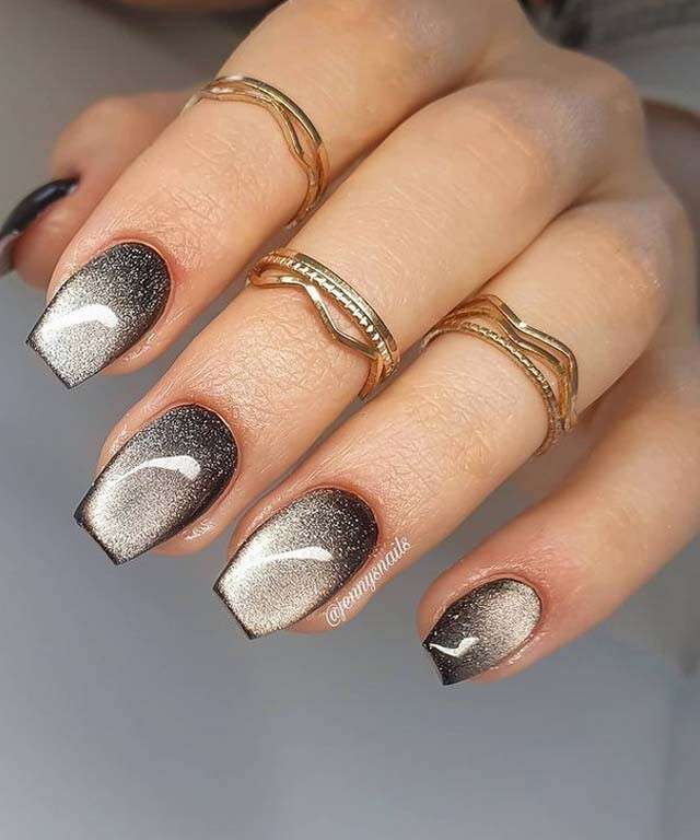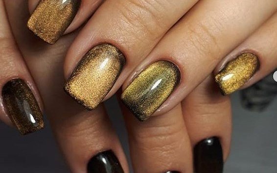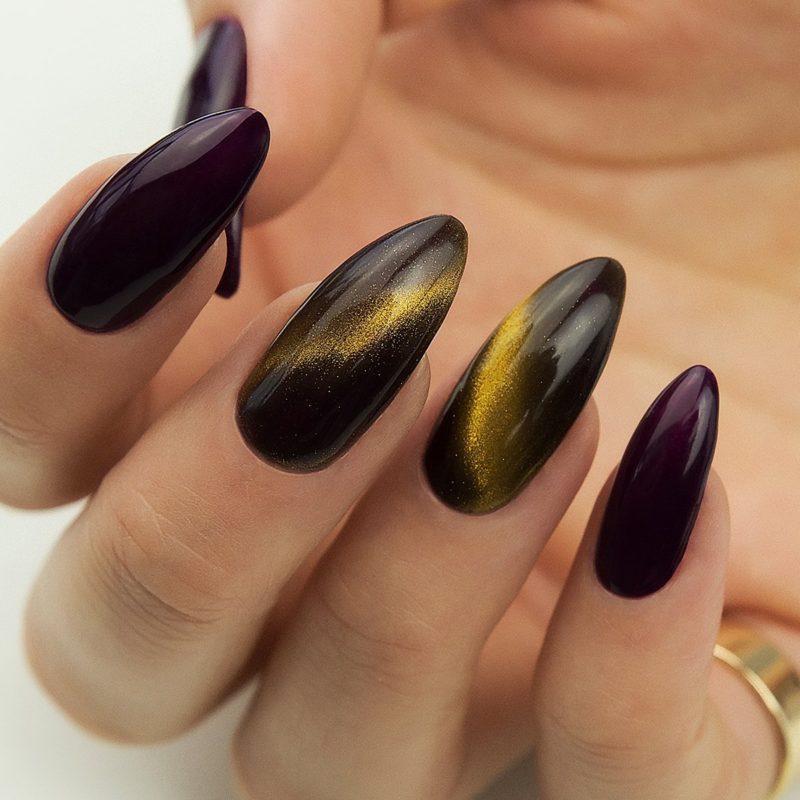 Золото и серебро — благородные металлы, которые нельзя упрекнуть в отсутствие блеска. Добавление эффекта кошачьего глаза создаст эффект, словно на ногти наносят расплавленный металл. Не стоит злоупотреблять таким покрытием — дополнительный декор может сделать маникюр вычурным и безвкусным.