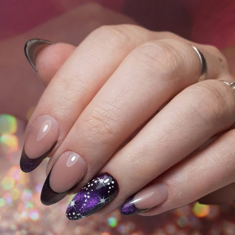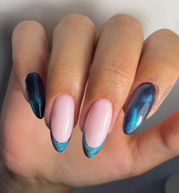 - сочетайте кошачий глаз с френчем. Последний актуален всегда и везде. Если дресс код организации не позволяет оформить все ноготки в столь ярком стиле, просто выделите всего один;