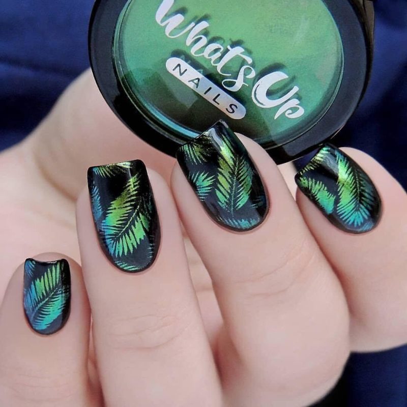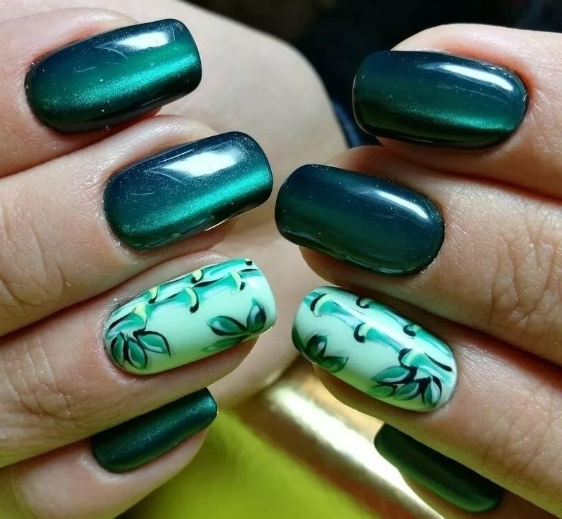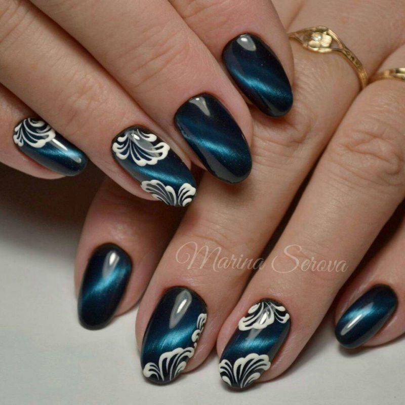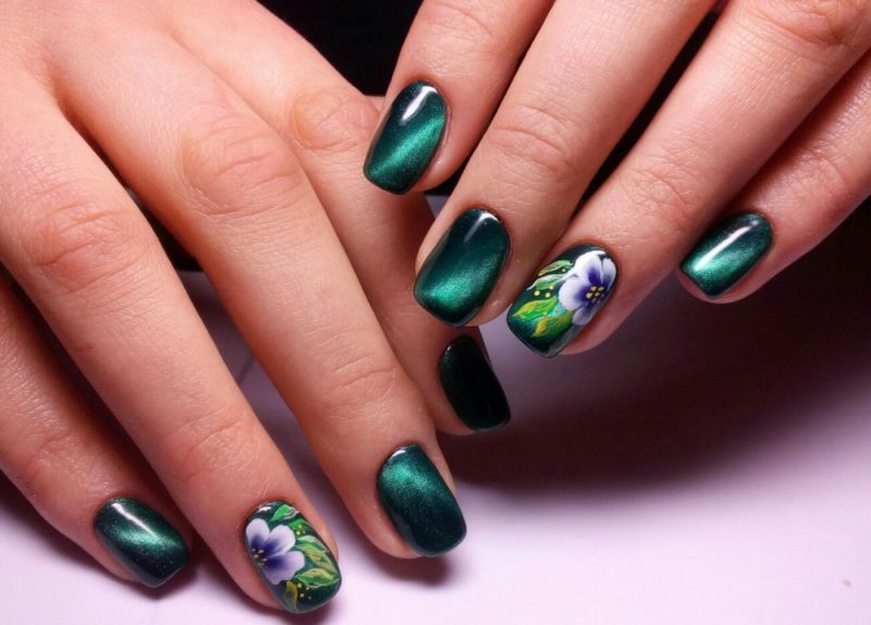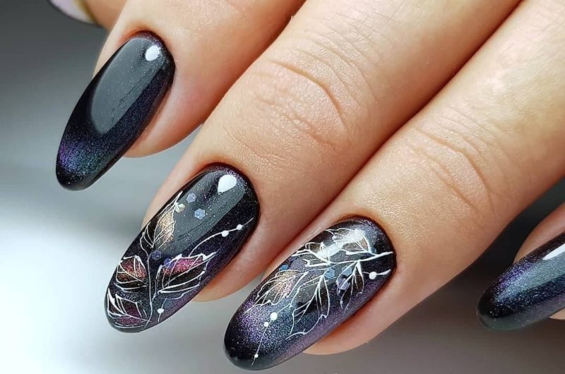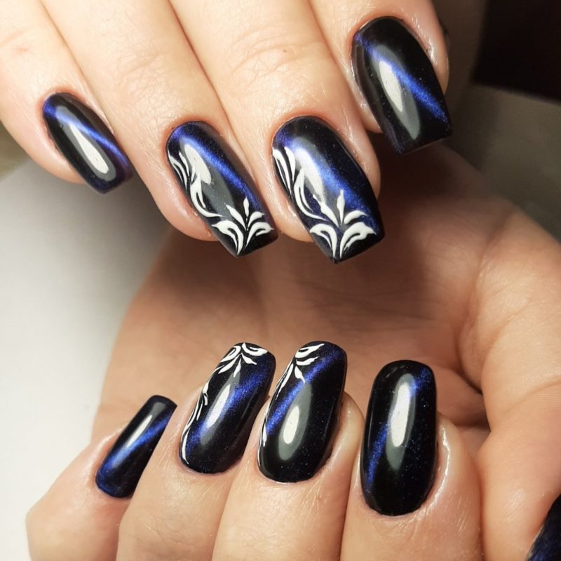 Загадочные переливы — отличная база для рисунков. Главное выбрать подходящую тематику. Ограничений нет. Например, глубокие оттенки отлично подходят для создания космического маникюра. Эффектно смотрятся растительные мотивы или, например, анималистичные.