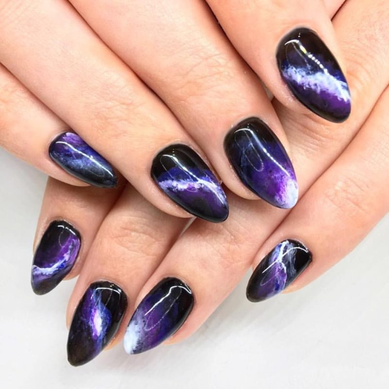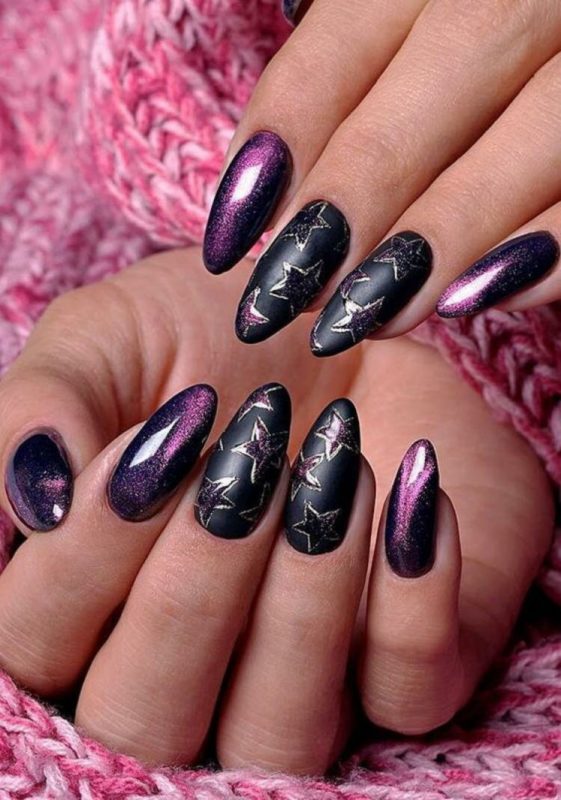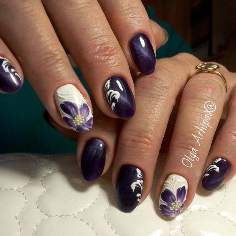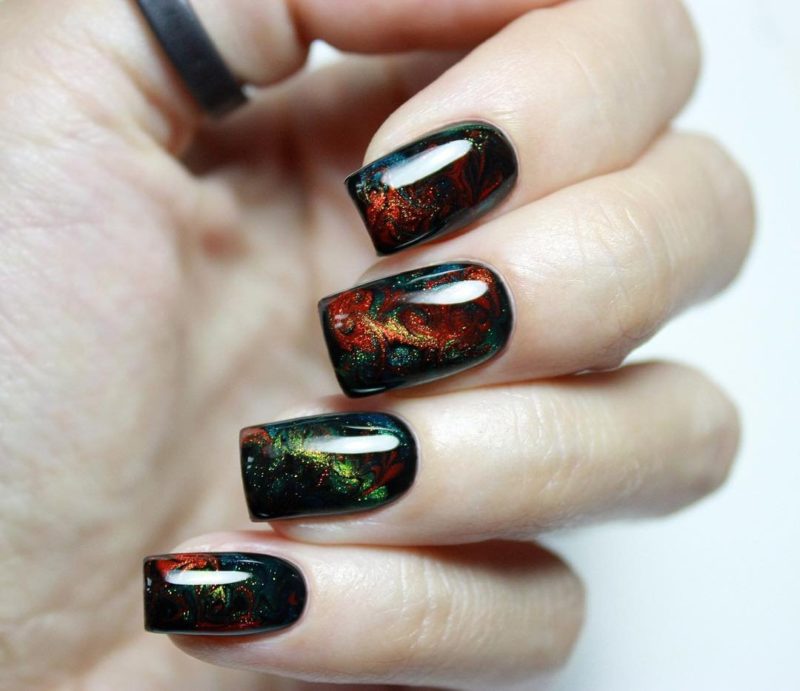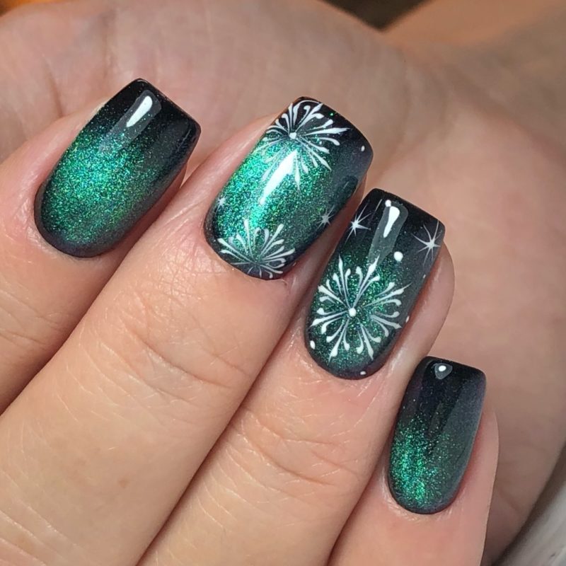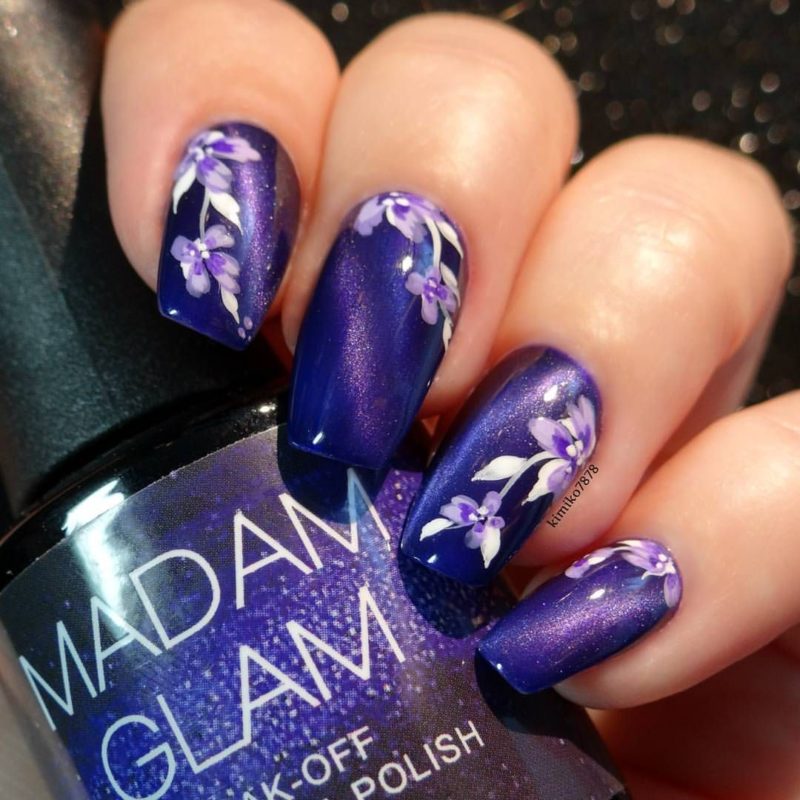 Загадочные переливы — отличная база для рисунков. Главное выбрать подходящую тематику. Ограничений нет. Например, глубокие оттенки отлично подходят для создания космического маникюра. Эффектно смотрятся растительные мотивы или, например, анималистичные.