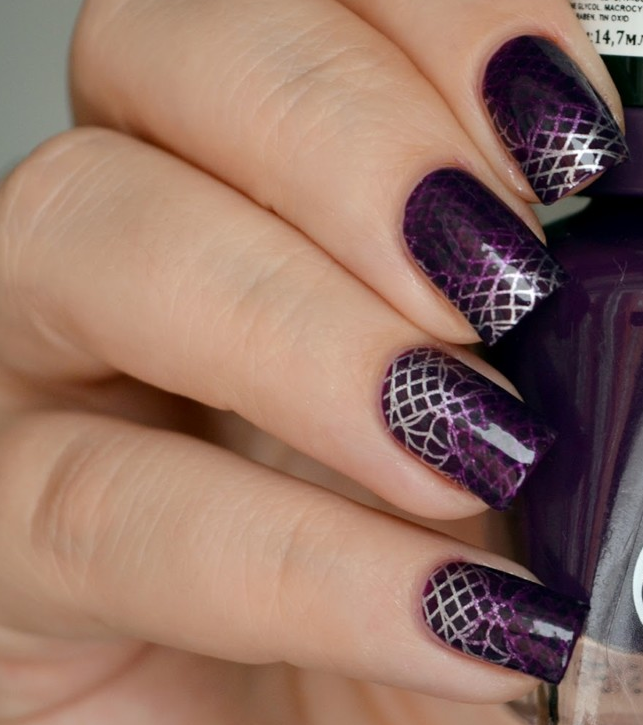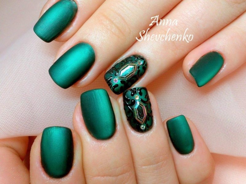 Стемпинг наиболее выигрышно смотрится именно с маникюром кошачий глаз. Достаточно выделить по одному пальчику на каждой руке, выбрав для базы матовый топ, и маникюр получится стильным и необычным.