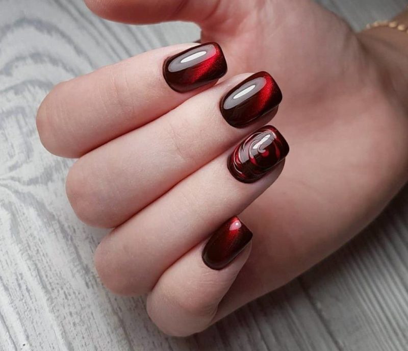 Палитра красного — это страсть, глубина и женственность. Глянцевый алый или винный маникюр долгое время находился на топовых позициях дизайна. Запросы современных модниц более взыскательны. Теперь мастера нейл арта предлагают украсить ноготки красным кошачьим глазом. Необязательно покрывать лаком всю пластину. Другие варианты: