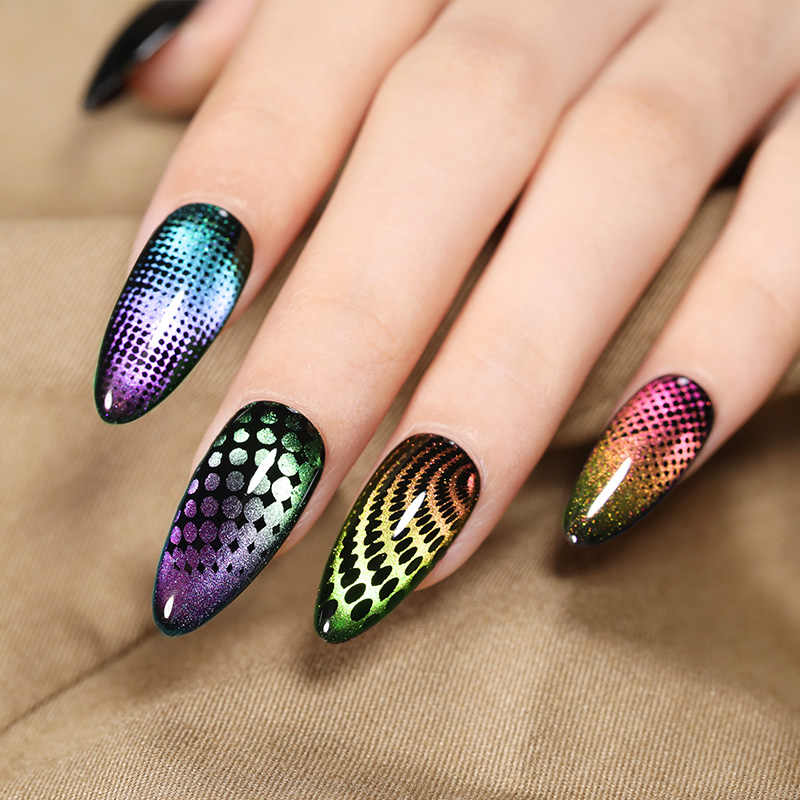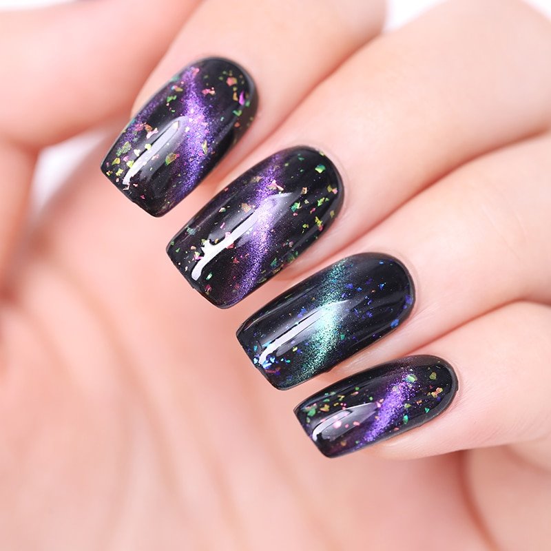 Благодаря магнитному составу эффектное покрытие создается сразу после его нанесения на ноготь. Однотонный вариант сам по себе эффектен. Для создания других потрясающих идей нужно будет воспользоваться дополнительными средствами, которыми располагает современный нейл арт.