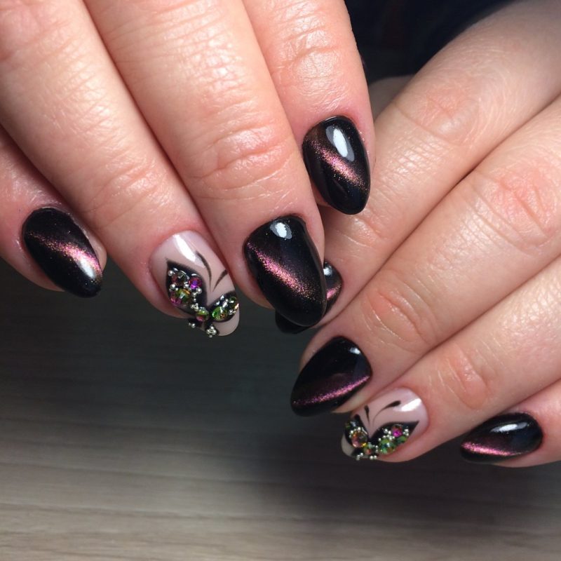 Привычный способ декорировать ногти. В зависимости от фантазии модницы такой маникюр может быть броским или минималистичным. Располагать камни можно любым способом: по краям, по лунке, на линии улыбки. С помощью страз можно дополнить рисунок, сделав его объемным. Для кошачьего глаза лучше выбирать камни близкого к базе оттенка.