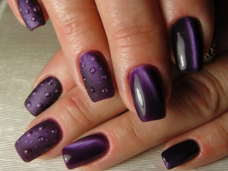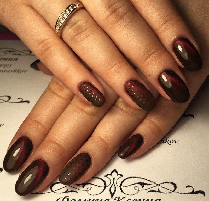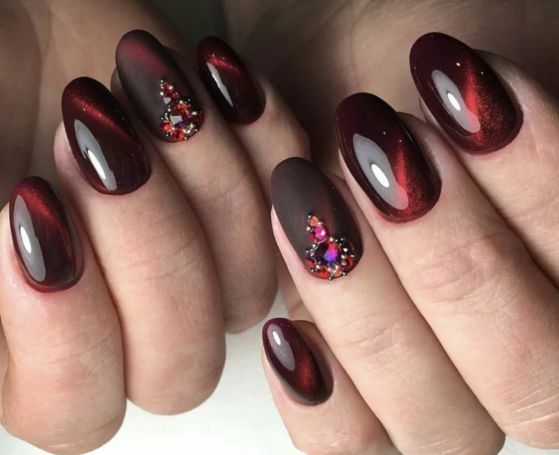 - чередование магнитного лака бордового оттенка и матовой текстуры;