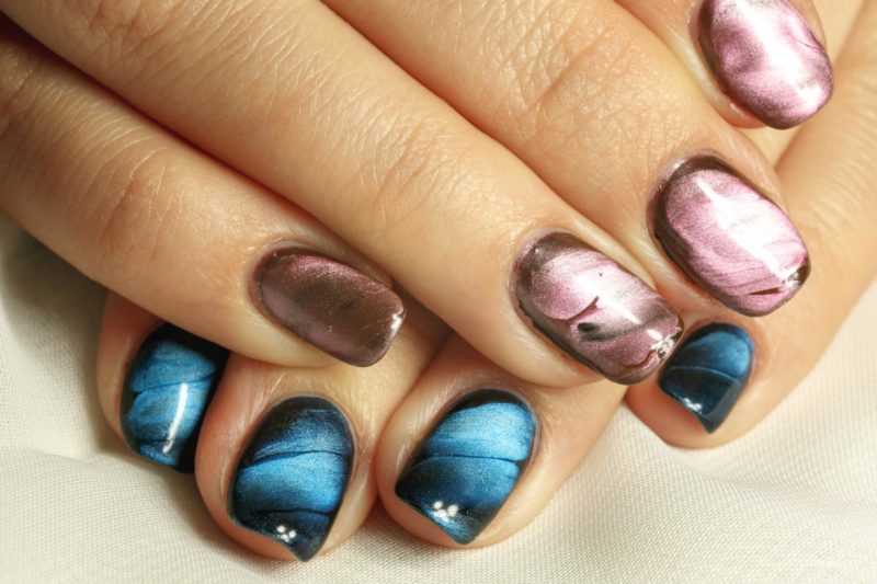 Переливающаяся фактура позволяет визуально удлинить пластину — как правило переливы «двигаются» вертикально или по диагонали. Однако, стоит тщательно выбирать базовый оттенок. Отлично смотрятся на короткой длине розовые, голубые, салатовые, охра, светло-серый оттенки. А вот с дополнительным декором маникюра стоит быть осторожнее. Подойдут нервные стразы, тонкие линии рисунка или мелкие стразы.