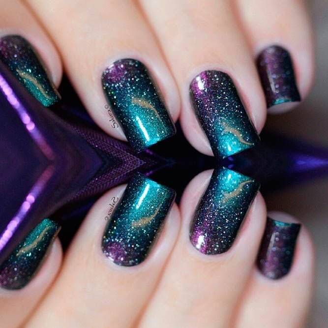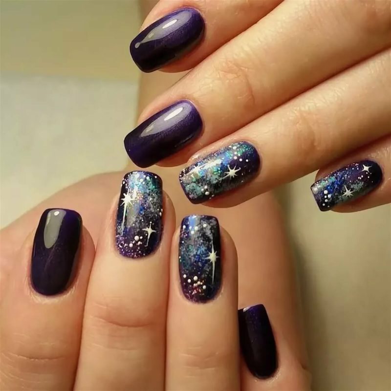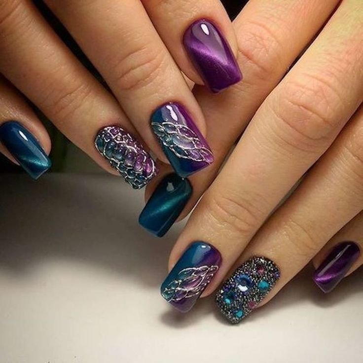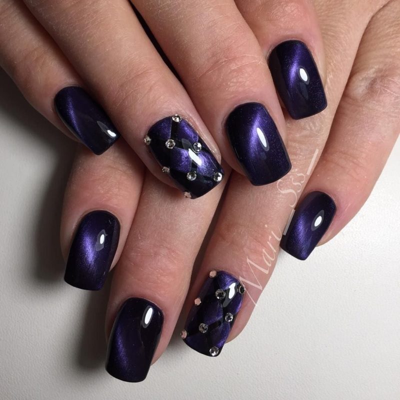 Не стоит думать, что квадратная форма не сможет ужиться с магнитным лаком. Просто выбирайте более глубокие тона и дополняйте платину разного рода украшениями: блестками, стразами, рисунками, наклейками. Очень эффектно смотрится на квадратной форме маникюр в стиле космос.
