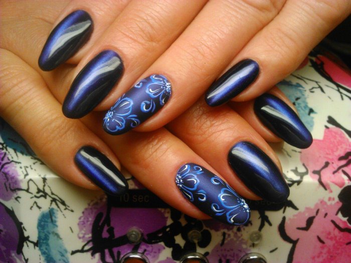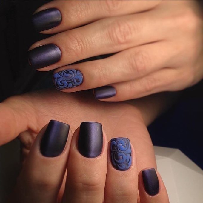 Для длинных ногтей лучше выбирать темные оттенки лака — глубокий синий, винный, черный и др. Покрытие может быть однотонным или с дополнительным дизайном. Например, можно выделить один или два ноготка матовой текстурой. Такой контраст смотрится очень эффектно.