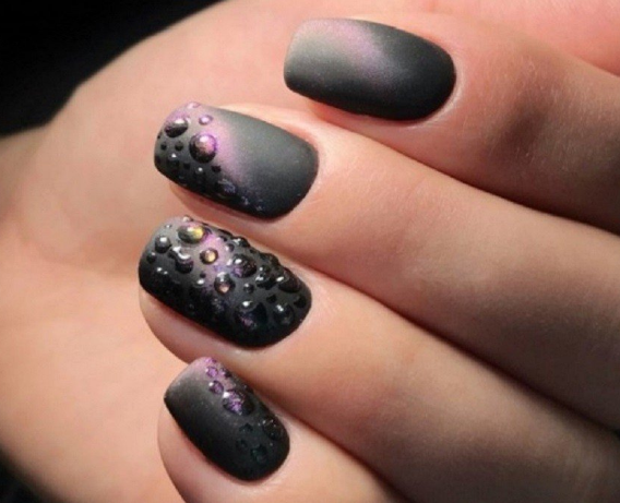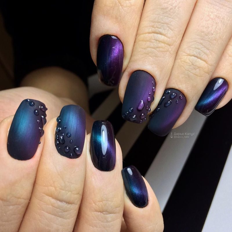 Капельки воды, нанесенные на переливающуюся плотную базу смотрятся необычно и эффектно, делая женские пальчики изящными. Технология нанесения проста: