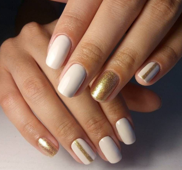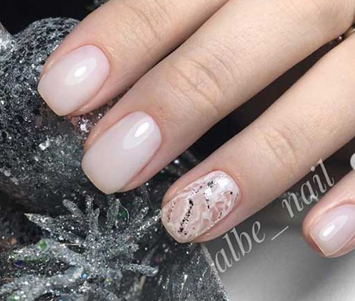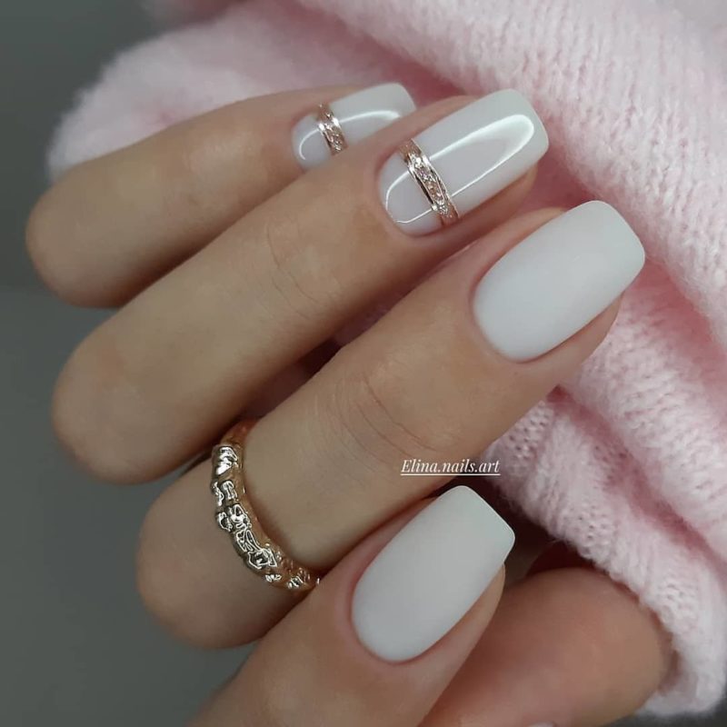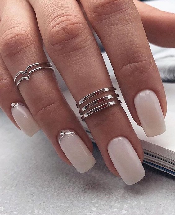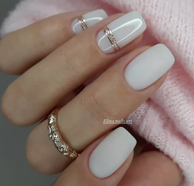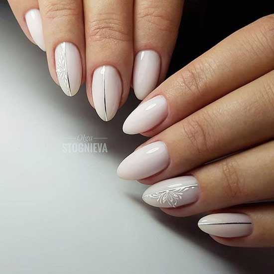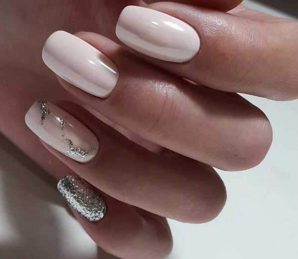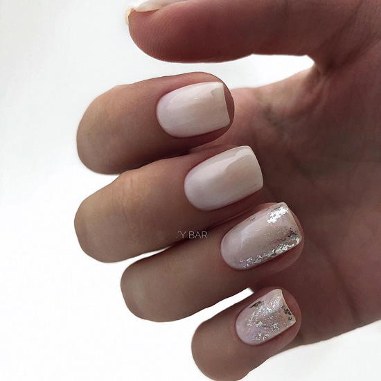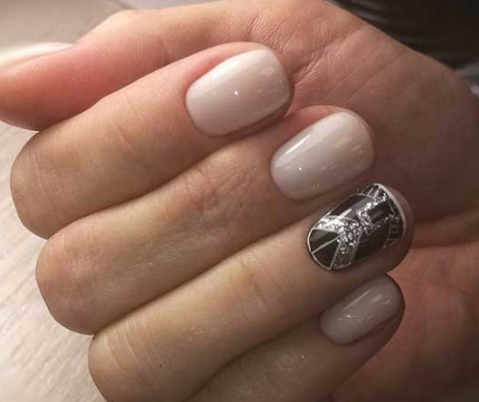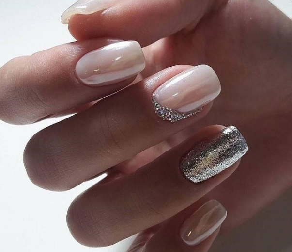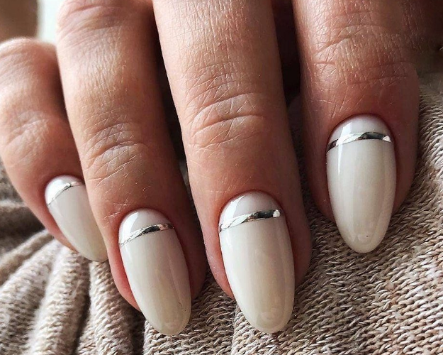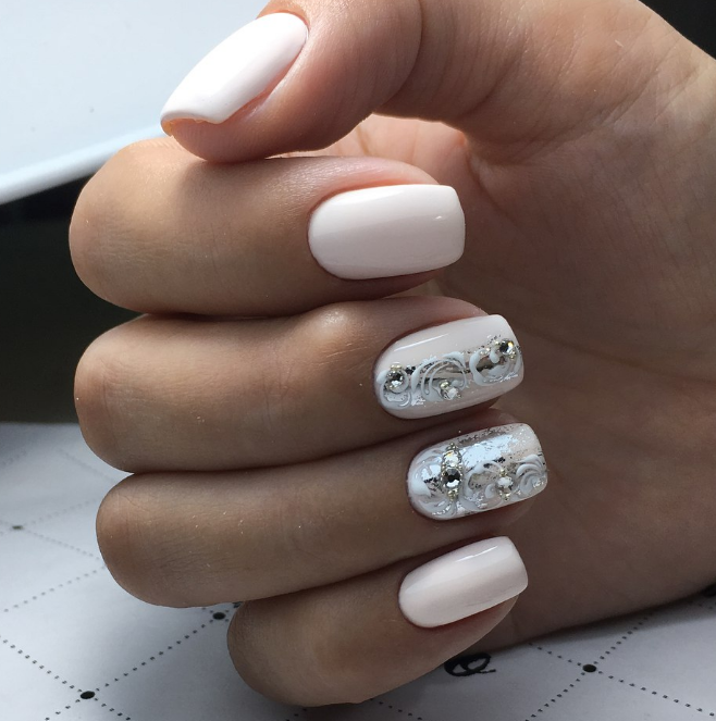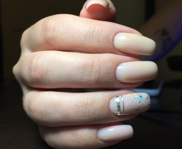 Серебряный или золотой цвет хорошо сочетается с молочным. Нюдовые оттенки предадут образу завершенность и утонченность. Маникюр нетрудно сделать самостоятельно.