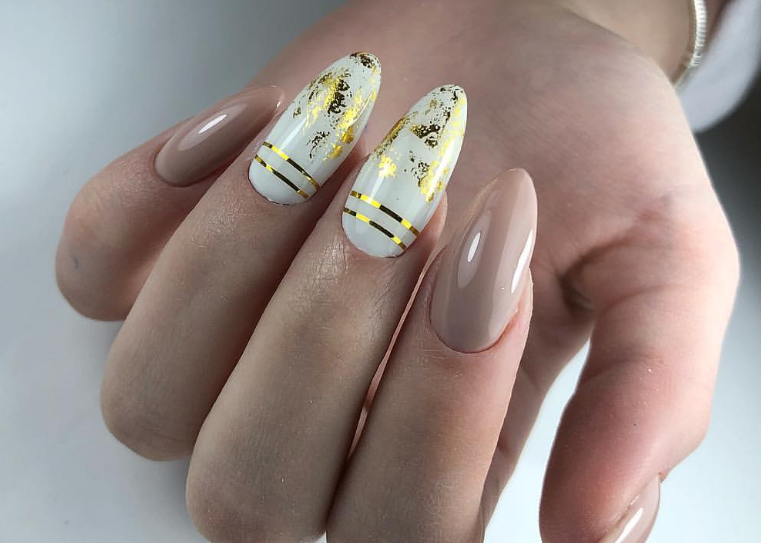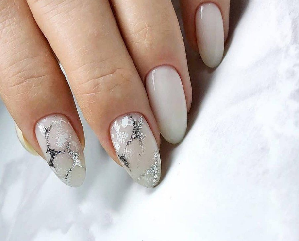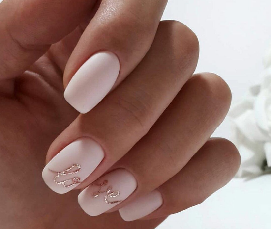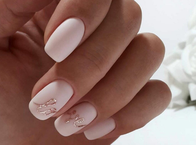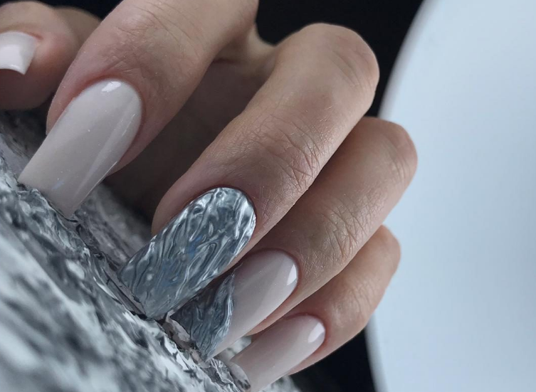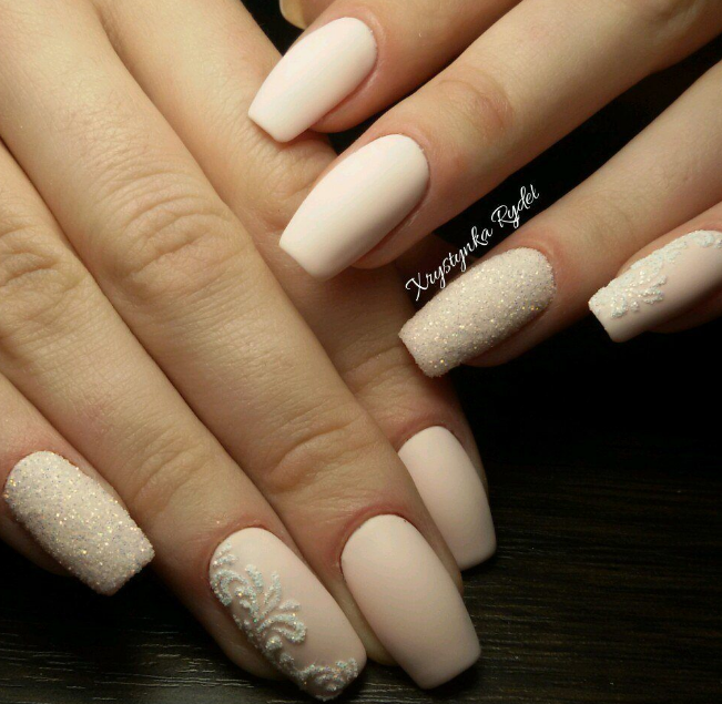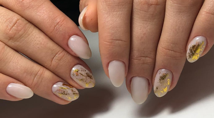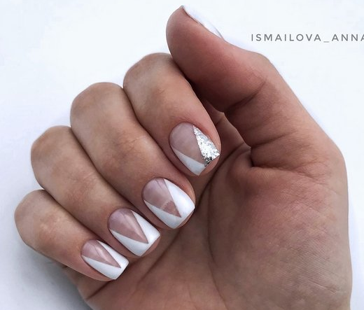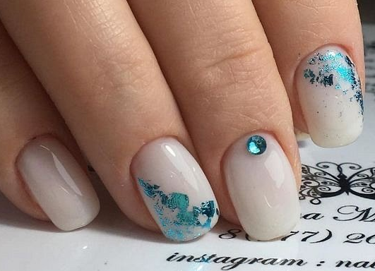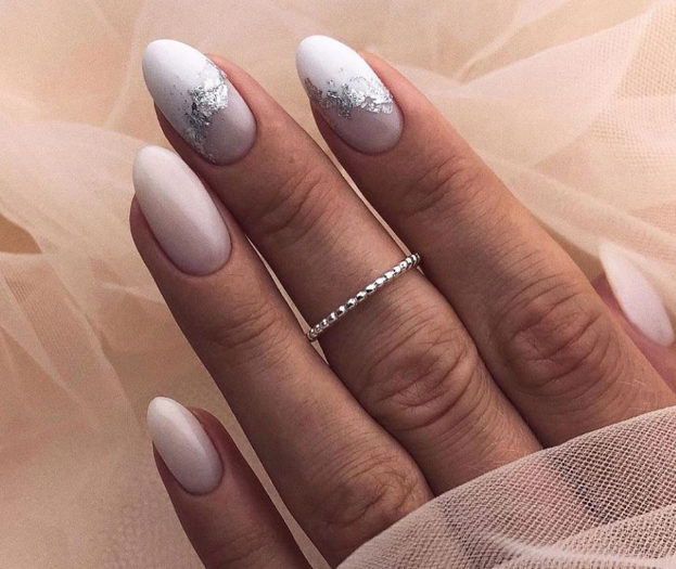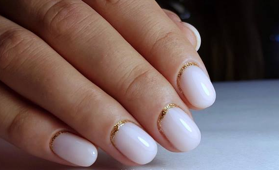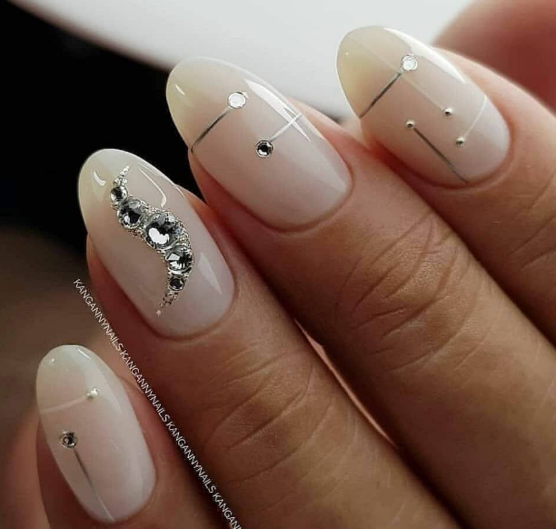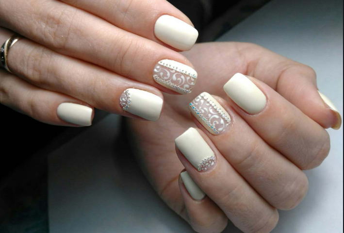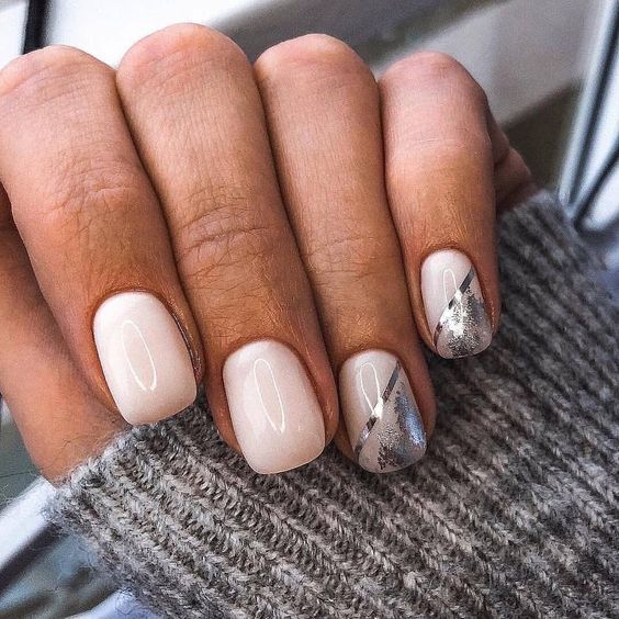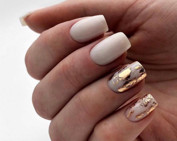 Серебряный или золотой цвет хорошо сочетается с молочным. Нюдовые оттенки предадут образу завершенность и утонченность. Маникюр нетрудно сделать самостоятельно.