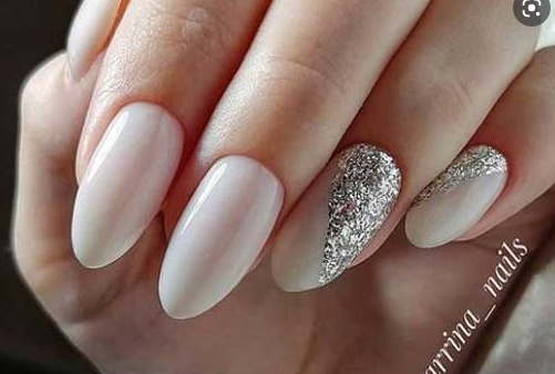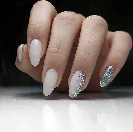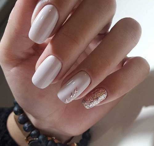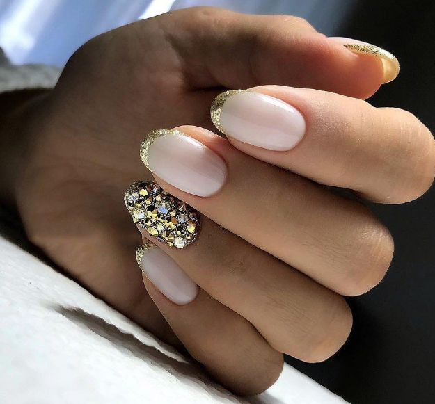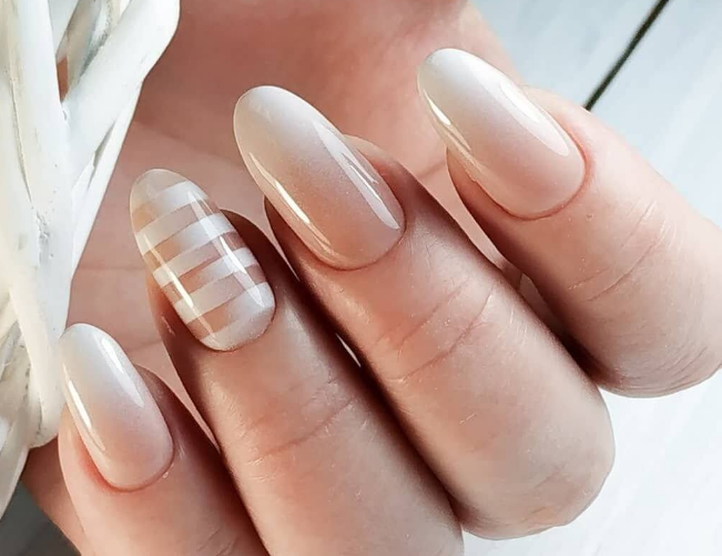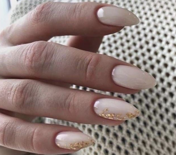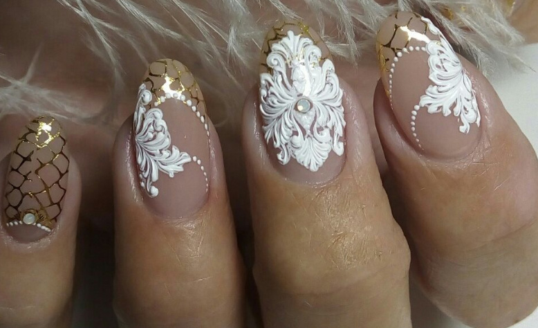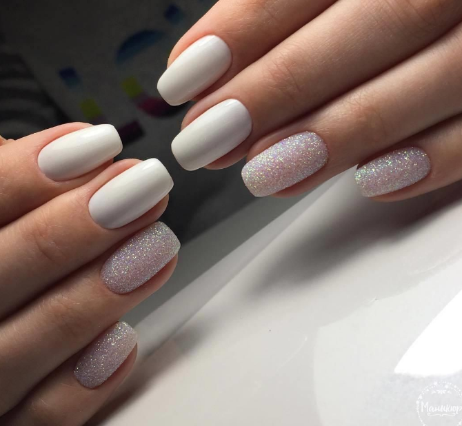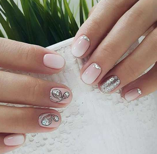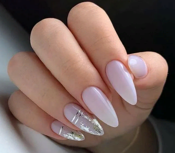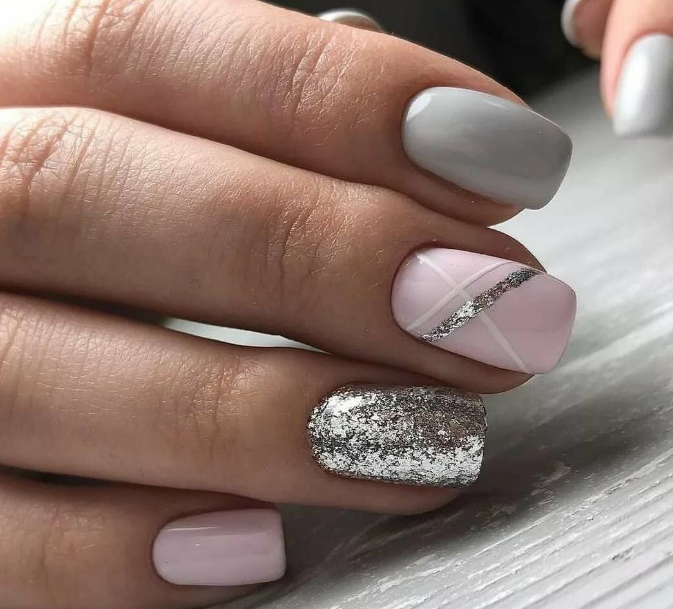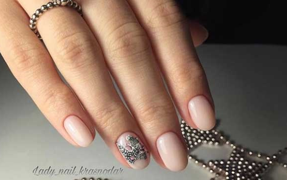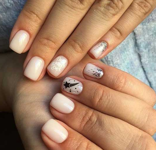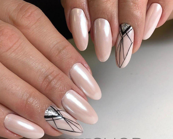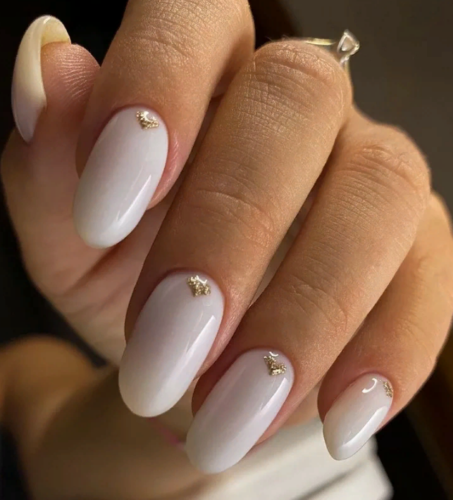 Серебряный или золотой цвет хорошо сочетается с молочным. Нюдовые оттенки предадут образу завершенность и утонченность. Маникюр нетрудно сделать самостоятельно.