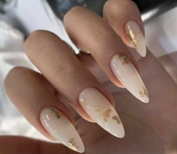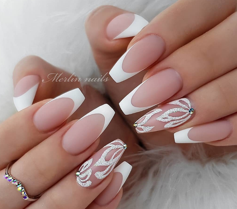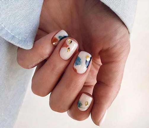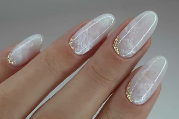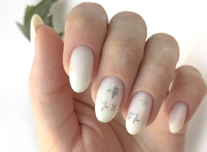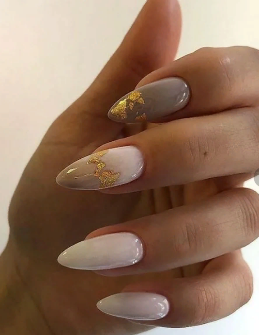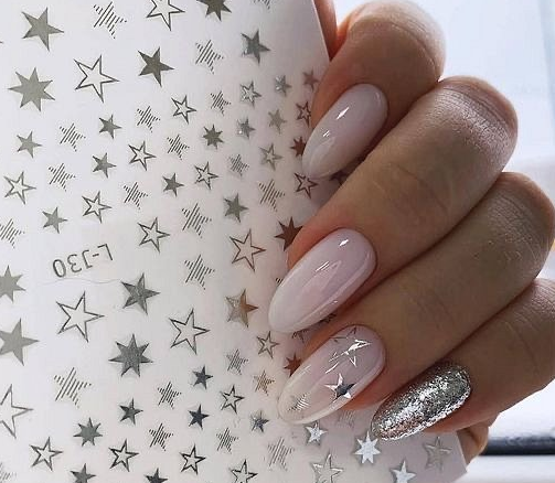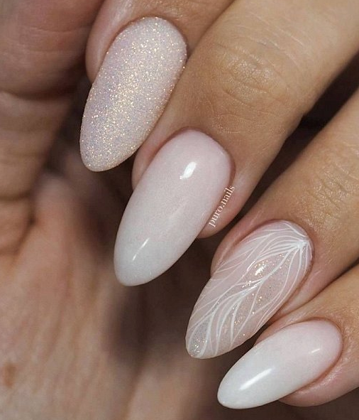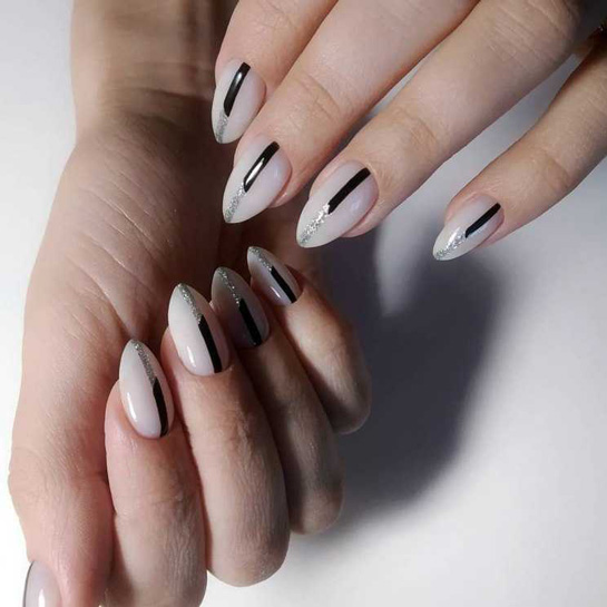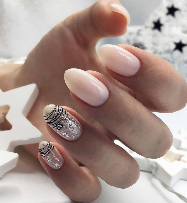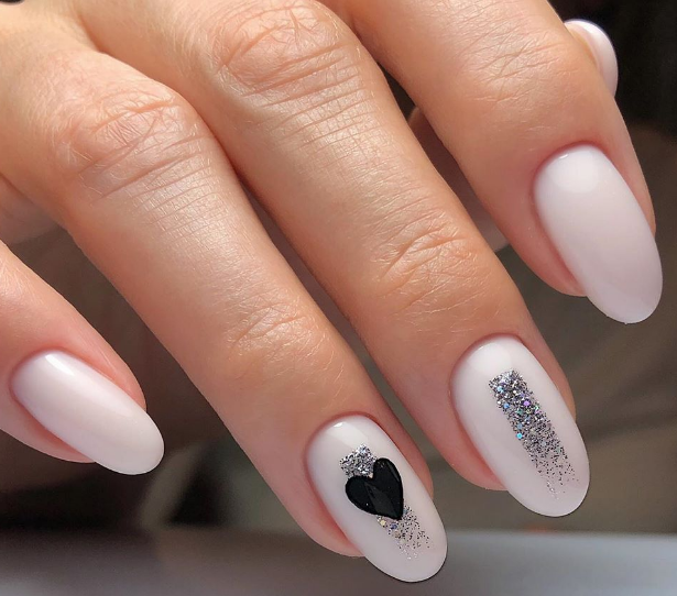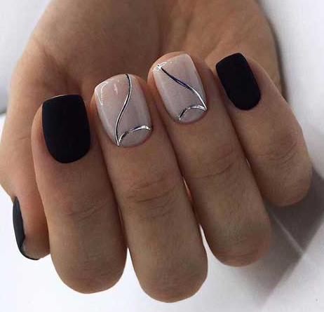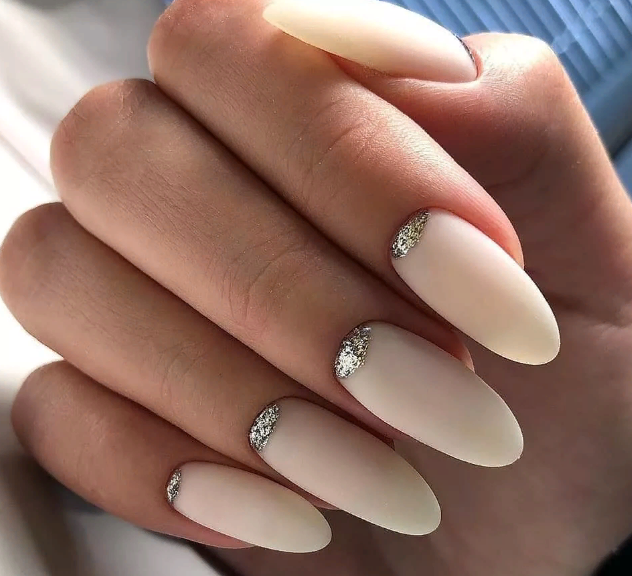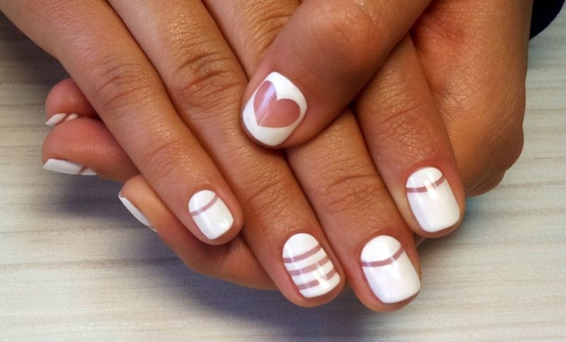 Серебряный или золотой цвет хорошо сочетается с молочным. Нюдовые оттенки предадут образу завершенность и утонченность. Маникюр нетрудно сделать самостоятельно.