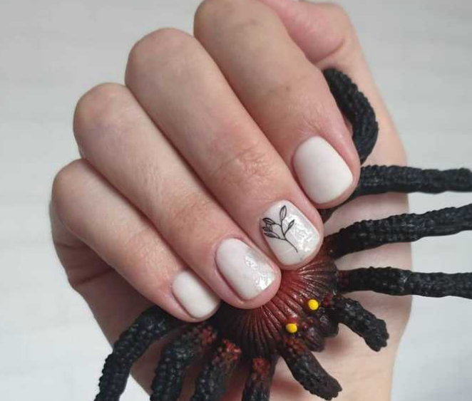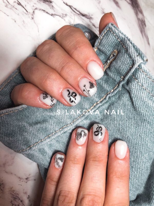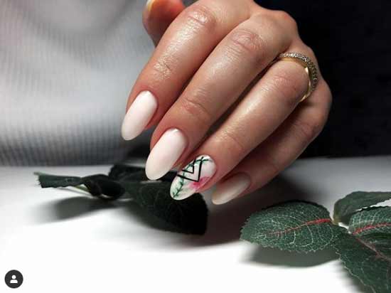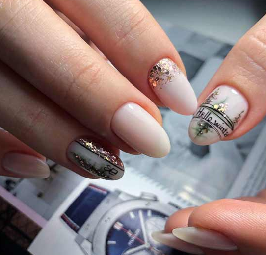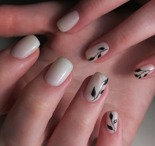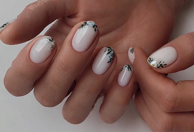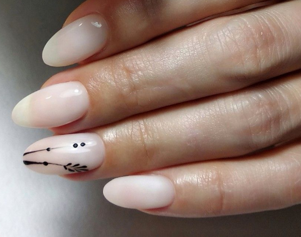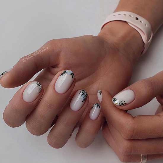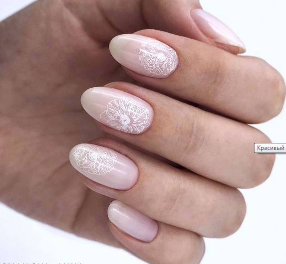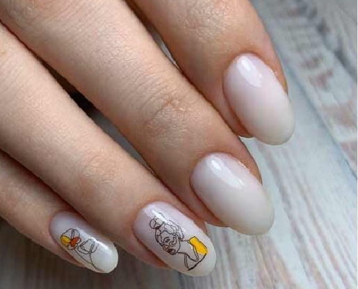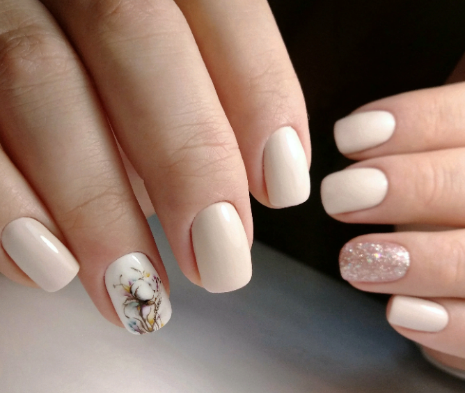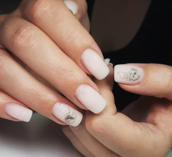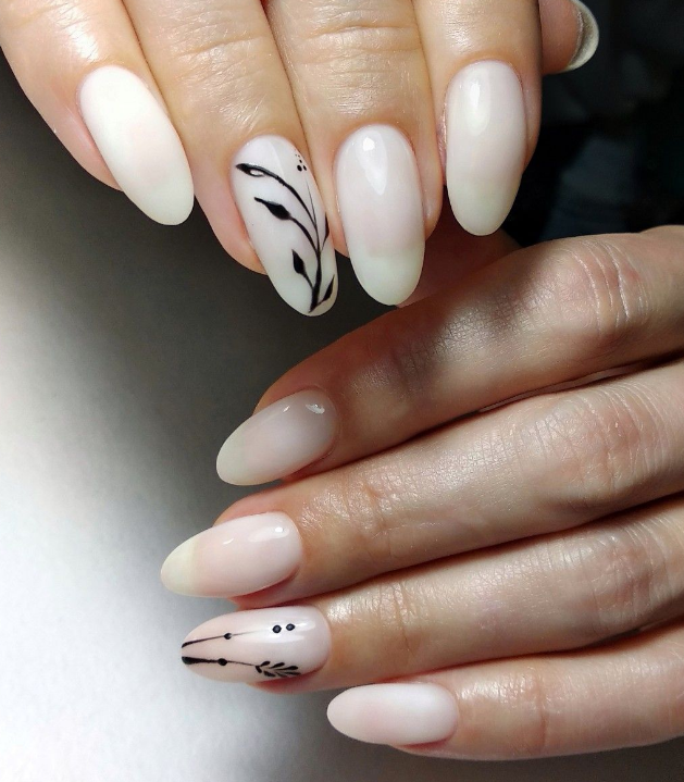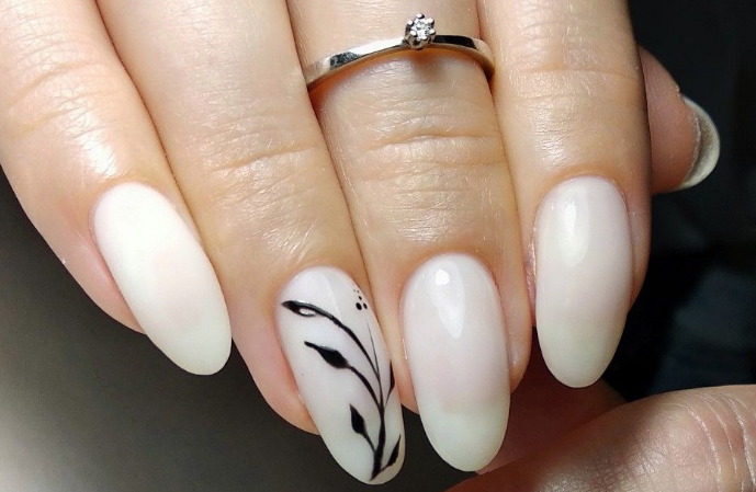 Дизайн ногтей молочного цвета с рисунком выполнить несложно. Вариантов несколько: можно составить сложную композицию. В этом помогут рисунки, стразы, втирка, фольга или блестки. На овальных ногтях выигрышно смотрятся несколько рисунков одновременно. Летом можно изобразить яркие цветы, зимой — снежинки или елочки.
