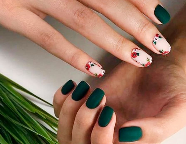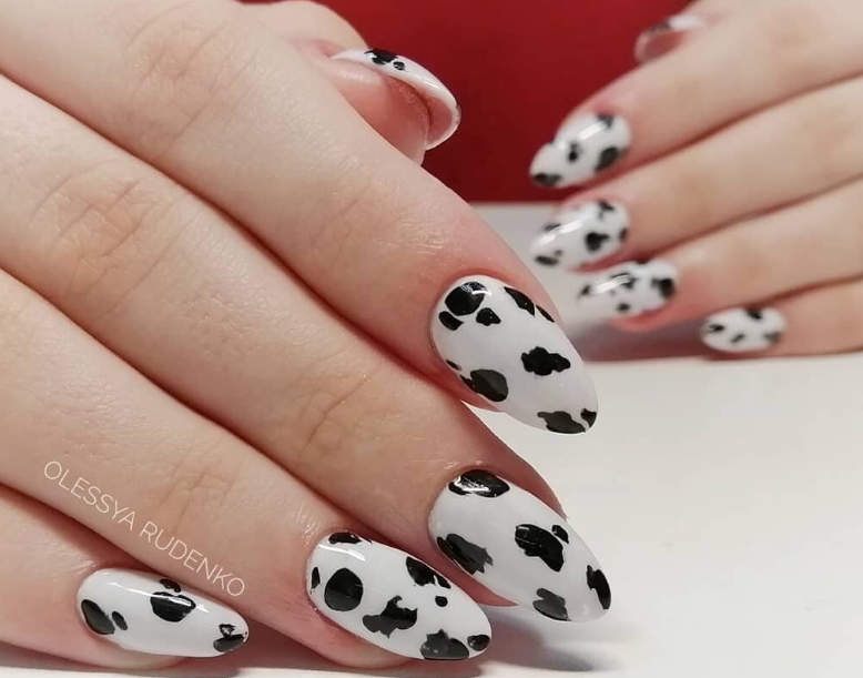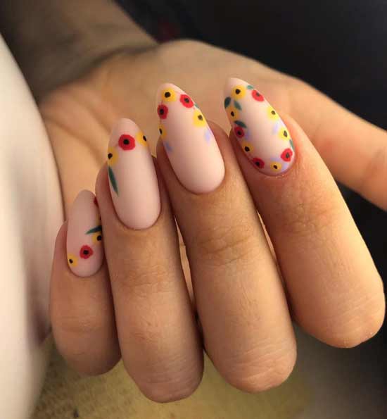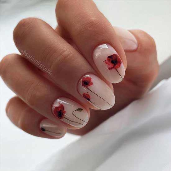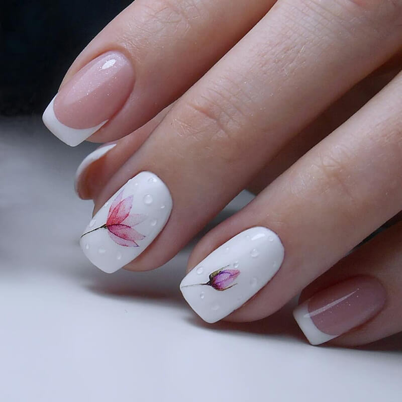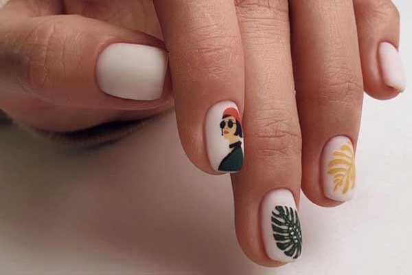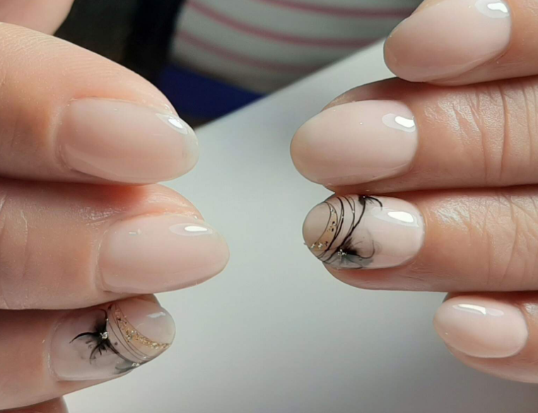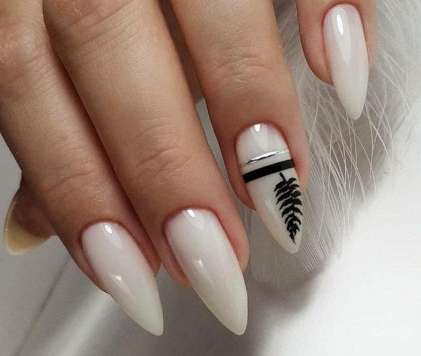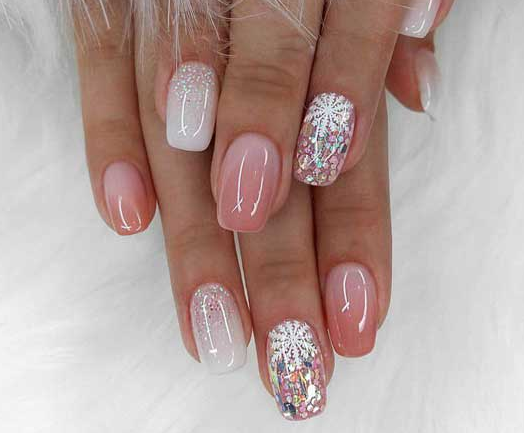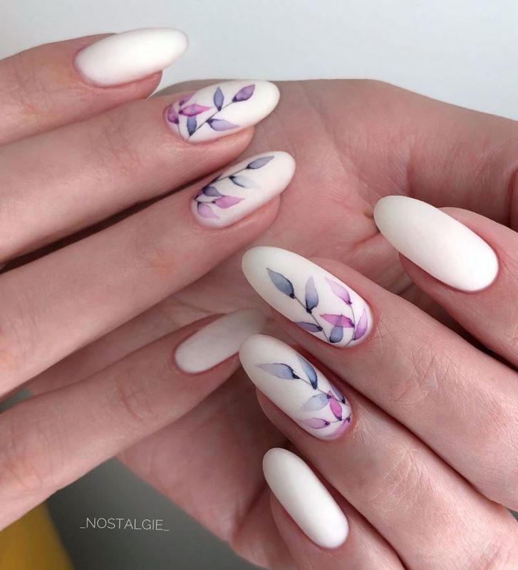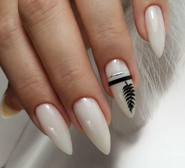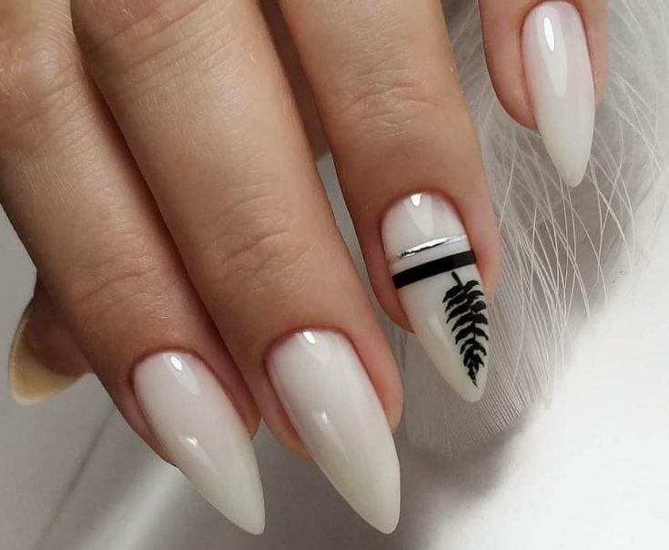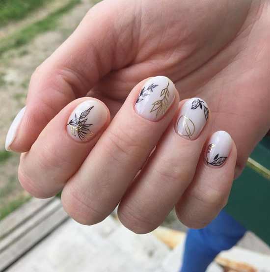 Дизайн ногтей молочного цвета с рисунком выполнить несложно. Вариантов несколько: можно составить сложную композицию. В этом помогут рисунки, стразы, втирка, фольга или блестки. На овальных ногтях выигрышно смотрятся несколько рисунков одновременно. Летом можно изобразить яркие цветы, зимой — снежинки или елочки.