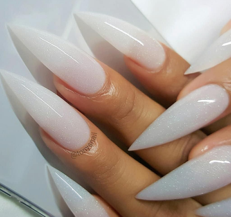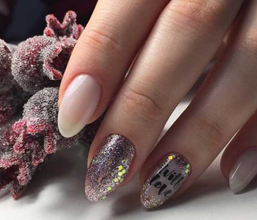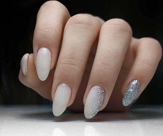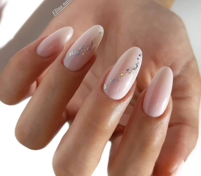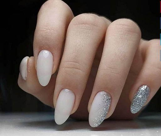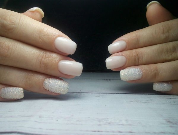Молочный маникюр с растяжкой блестками популярен среди юных девушек. Дизайн разнообразный: на ногти можно нанести втирку или изобразить этнический орнамент блестящим лаком. Акцентировать внимание нужно на 1-2 пальцах руки, остальные просто покрывают молочной базой. Такой дизайн подходит для ежедневной носки. На ногтях молочная база с блестящими вкраплениями смотрится стильно.