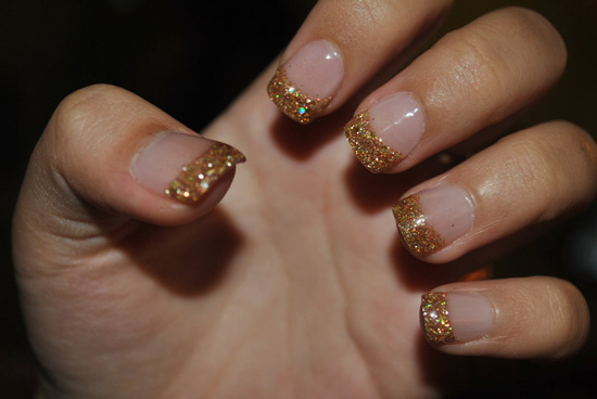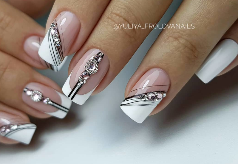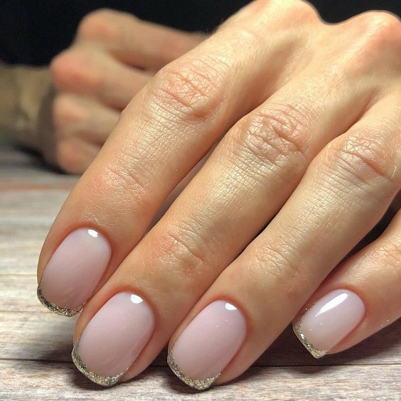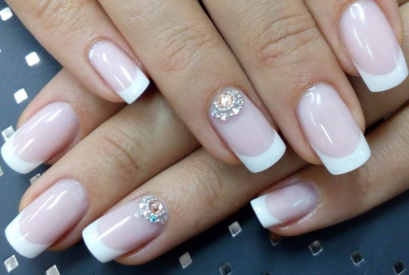 Выполняют маникюр по стандартной технике: сначала пластину покрывают молочной базой, затем наносят кайму на кончик ногтя. Можно украсить ногти фольгой, блестками или стразами. Также пользуется популярностью дизайн с металлической втиркой.