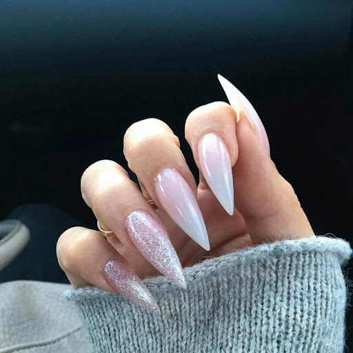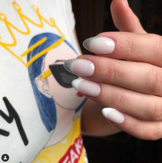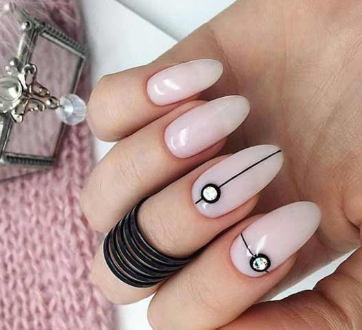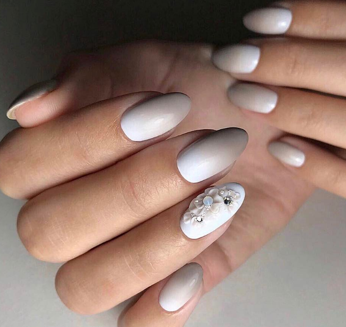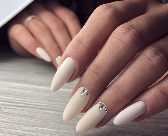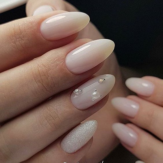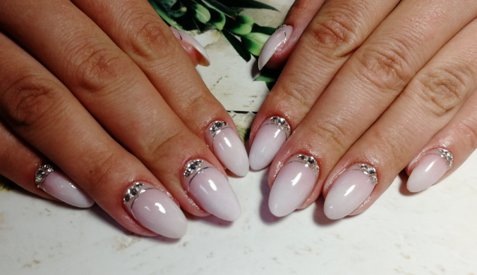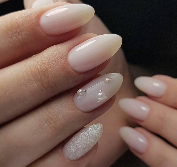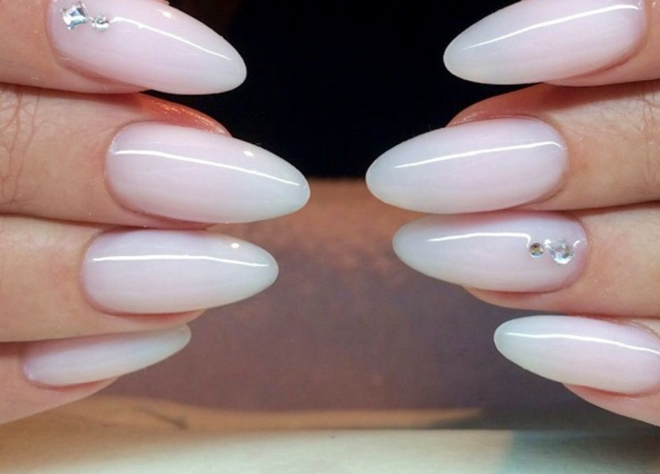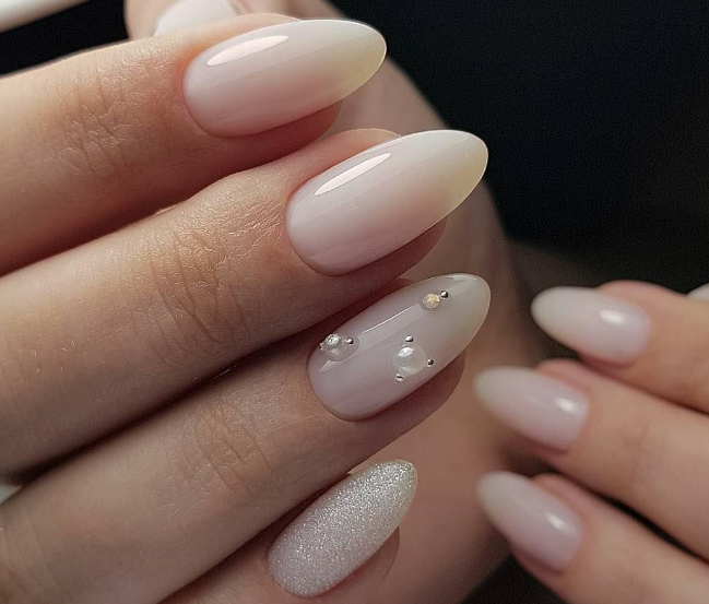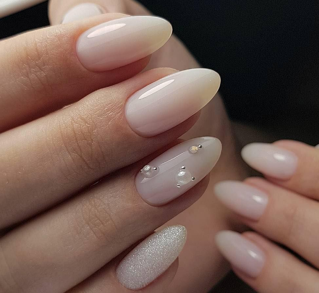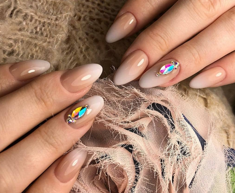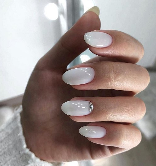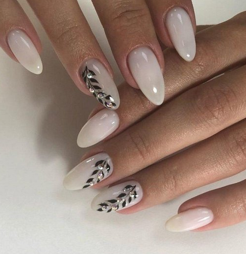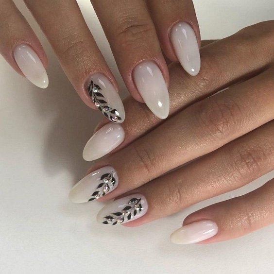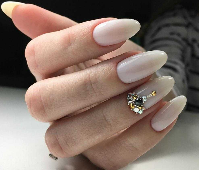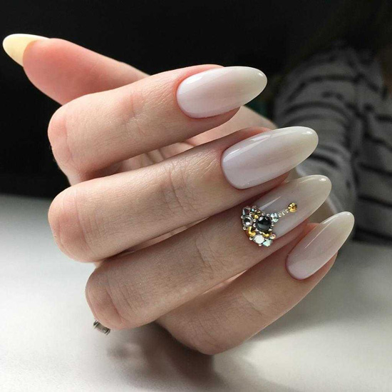 Маникюр градиент с молочной базой можно украсить стразами разного размера. Блестящие камни будут выигрышно смотреться на длинных ногтях овальной или миндалевидной формы.