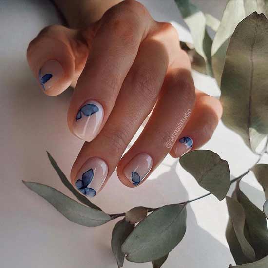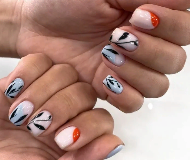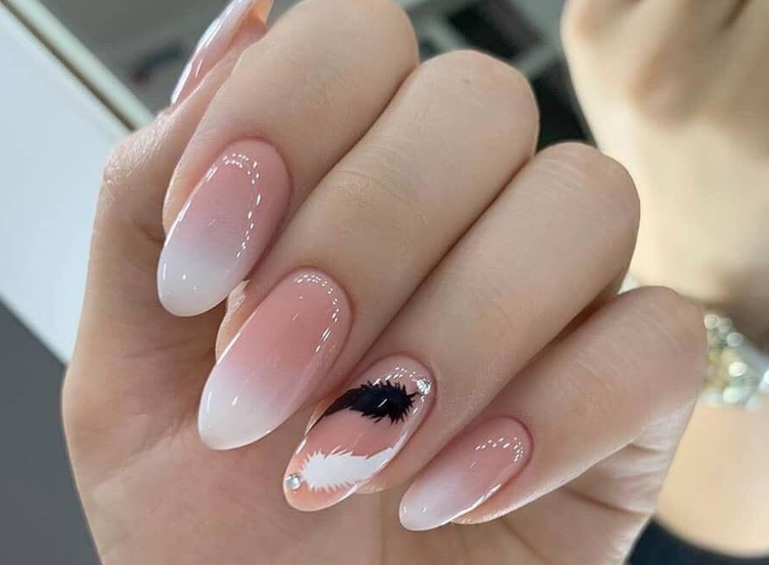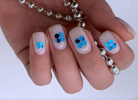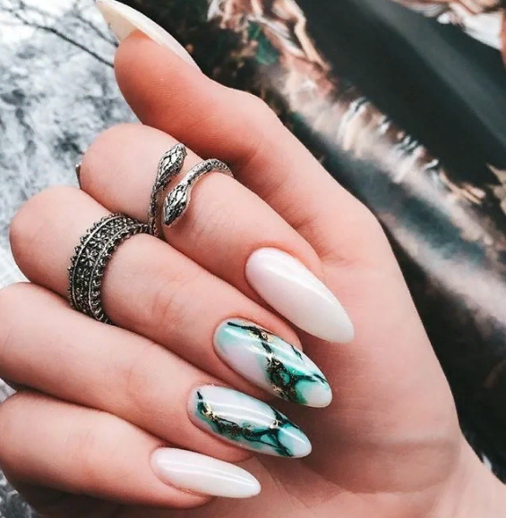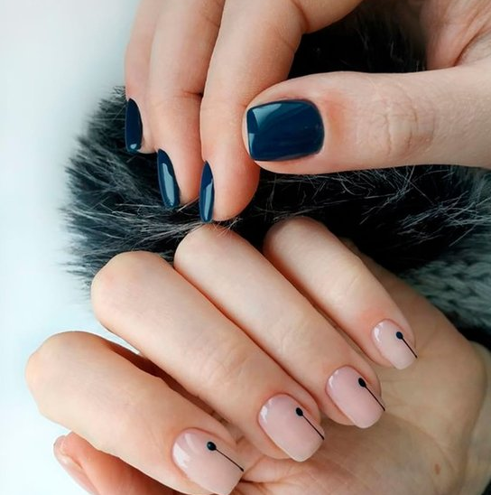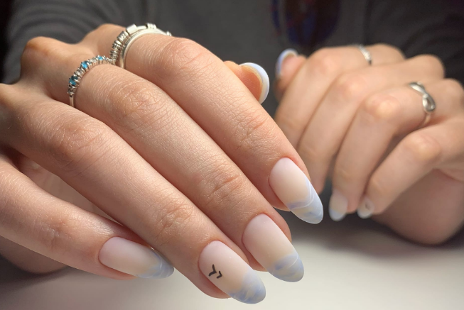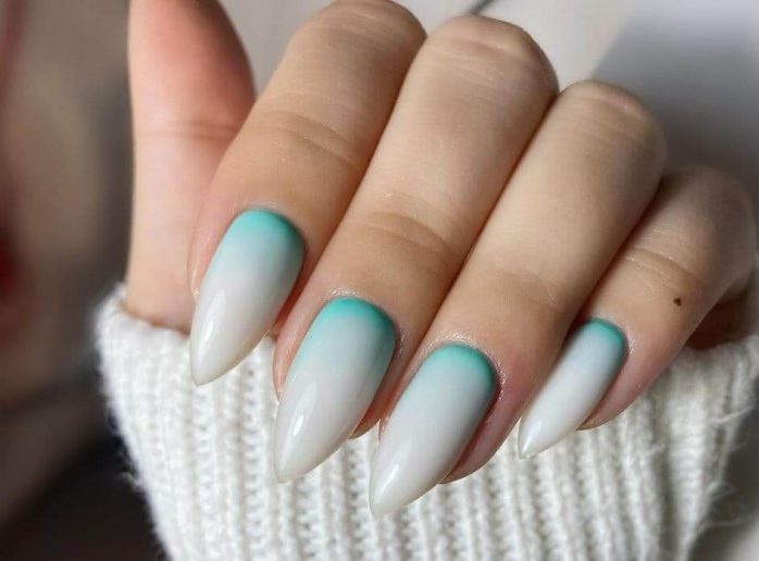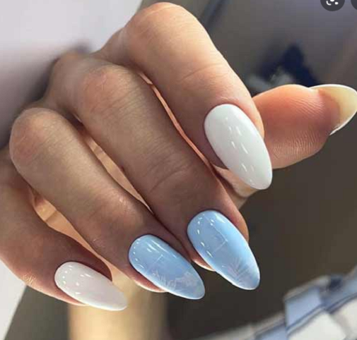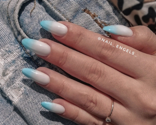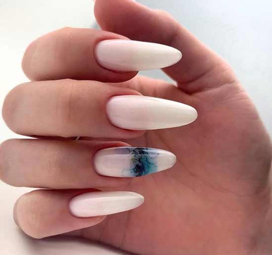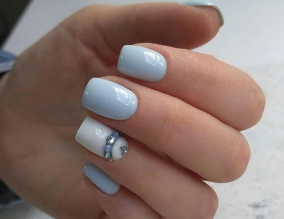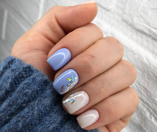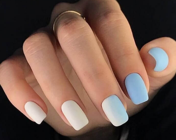 Эти оттенки хорошо сочетаются друг с другом. Комбинируют их во время выполнения маникюра в стиле омбре или градиент. Сначала ногти покрывают молочной базой, затем наносят голубой, «растягивая» каплю от основания пластины к ее кончику. Цвет получается немного размытым.